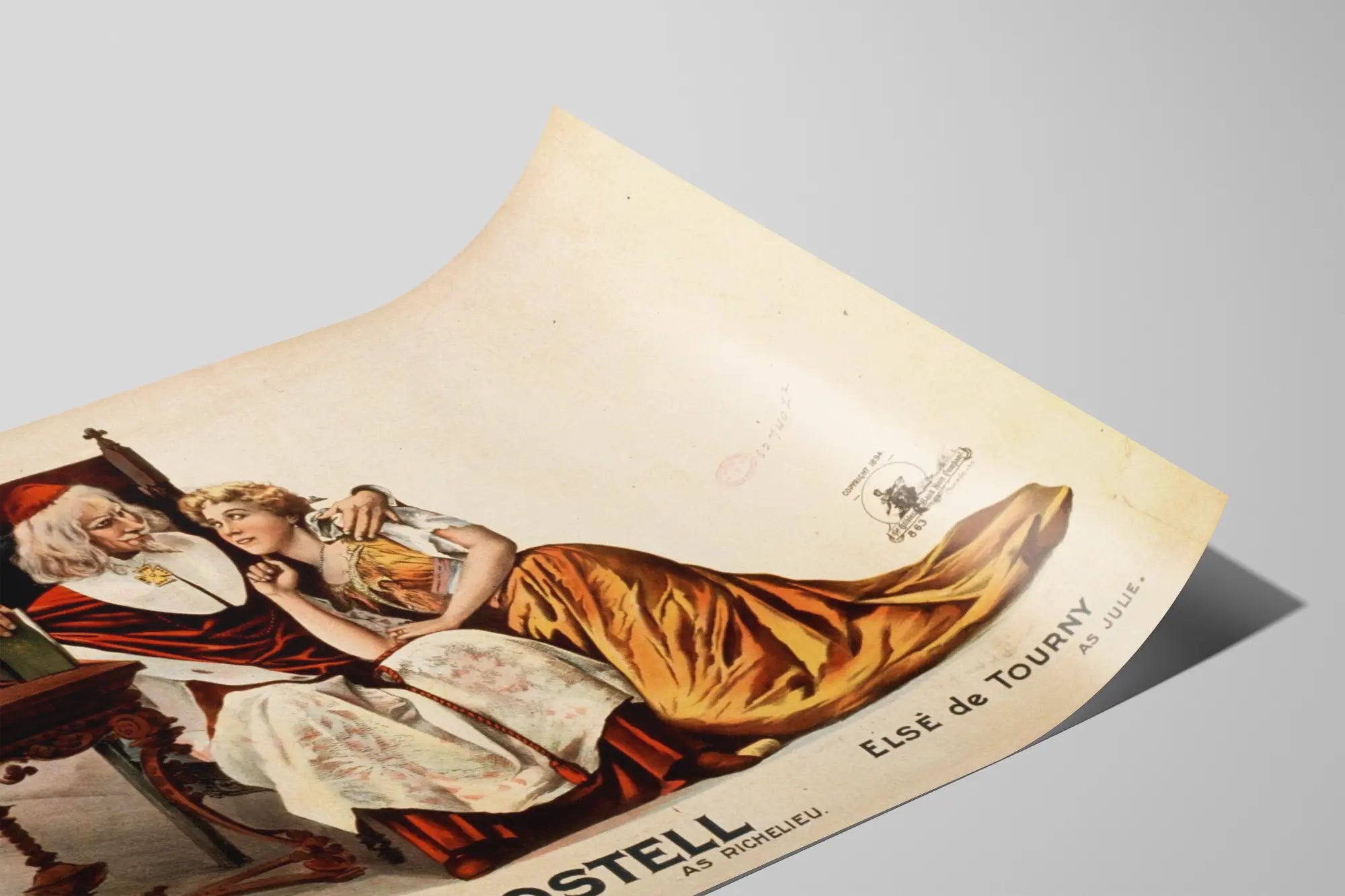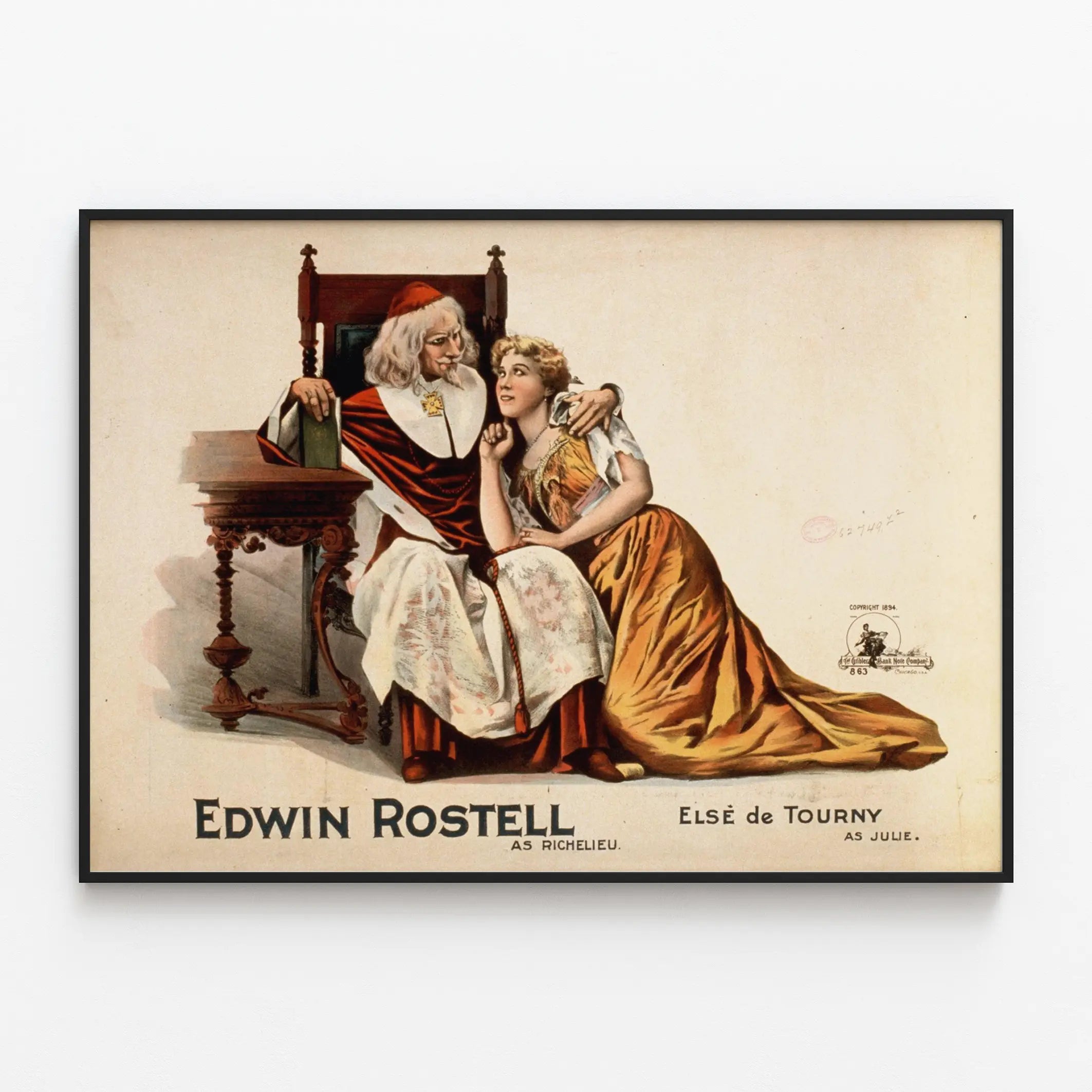 Découvrez cette affiche vintage illustrant une scène théâtrale mettant en vedette Edwin Rostell dans le rôle de Richelieu et Else de Tourny dans celui de Julie. Cette décoration murale offre un style ancien et élégant, idéal pour les amateurs de théâtre, d'histoire ou de représentations classiques. Le poster montre Richelieu, vêtu d'une tenue riche aux tons rouges et blancs, assis sur un fauteuil orné, tenant un livre d'une main et posant l'autre sur l'épaule de Julie, qui est accroupie à ses côtés avec une expression attentive. Julie porte une robe longue et fluide aux teintes chaudes d'ocre et de rouille. L'ambiance générale dégage une atmosphère intime et expressive, marquée par un regard complice entre les deux personnages. Ce tableau imprimé est parfait pour enrichir une décoration murale dans un salon, un bureau ou une bibliothèque, apportant une touche de culture et d'authenticité à votre intérieur. En affichant cette image, vous créez un dialogue entre art et histoire théâtrale, tout en valorisant un style décoratif vintage très recherché. Le fond sobre met en valeur les costumes détaillés et le jeu d'ombres et de lumière, renforçant ainsi l'impact visuel et émotionnel du poster. Idéal pour les passionnés de décoration murale consacrée aux arts dramatiques, cette affiche sera une pièce maîtresse qui capte l'attention et invite à la réflexion sur les personnages et leurs relations. Apportez charme et élégance à vos murs grâce à cette œuvre imprimée illustrant une scène captivante de théâtre classique.
