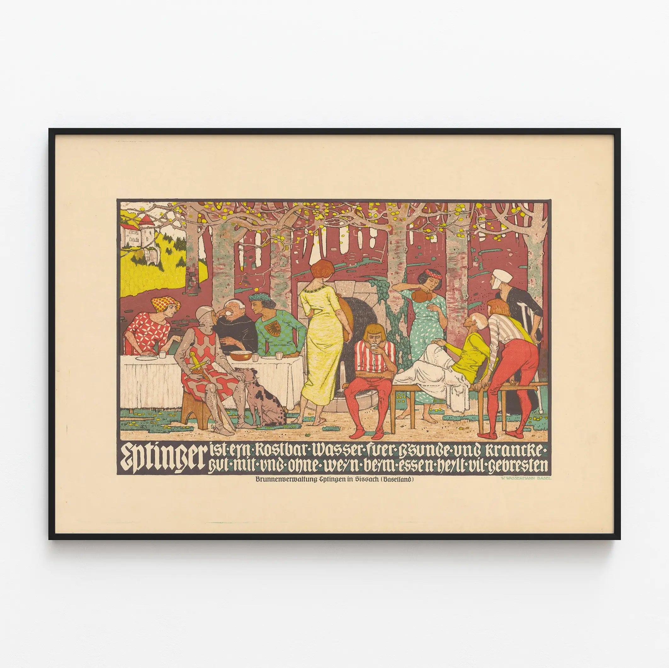 Cette affiche vintage illustre une scène extérieure chaleureuse réunissant plusieurs personnages d'époque médiévale autour d'un repas. On y voit un chevalier en armure assis près d'un chien, des personnages vêtus de costumes colorés, et une femme versant un liquide, vraisemblablement de l'eau, dans un verre. Le décor est planté dans une forêt aux arbres dépouillés mais parsemés de fruits jaunes lumineux, ajoutant une touche vibrante à cette composition. L'œuvre repose sur un style graphique typique des affiches anciennes, avec un cadre noir encadrant le dessin et une inscription en lettres gothiques en bas "Eptinger ist ein kostbar Wasser für Gesunde und Kranke gut mit und ohne Wein beim Essen heÿlt viel Gebresten", ce qui signifie que l'eau d'Eptingen est une eau précieuse bonne pour les sains et les malades, consommée avec ou sans vin au repas, et aidant à guérir de nombreux maux. Cette affiche peut devenir une décoration murale originale et élégante, convenant particulièrement aux intérieurs de style rétro ou vintage, mais aussi à ceux qui apprécient l'art graphique et la publicité ancienne. Elle apportera une touche d'authenticité et un point focal intéressant sur un mur, qu'elle soit encadrée sous verre ou en poster. Parfaite pour les passionnés de décoration murale, d'affiches anciennes ou pour donner du caractère à un espace de vie, ce tableau imprimé reflète un héritage culturel et une esthétique soignée. Ce poster vintage saura séduire les amateurs de styles médiévaux et d'illustrations historiques, apportant chaleur et style à votre décoration.