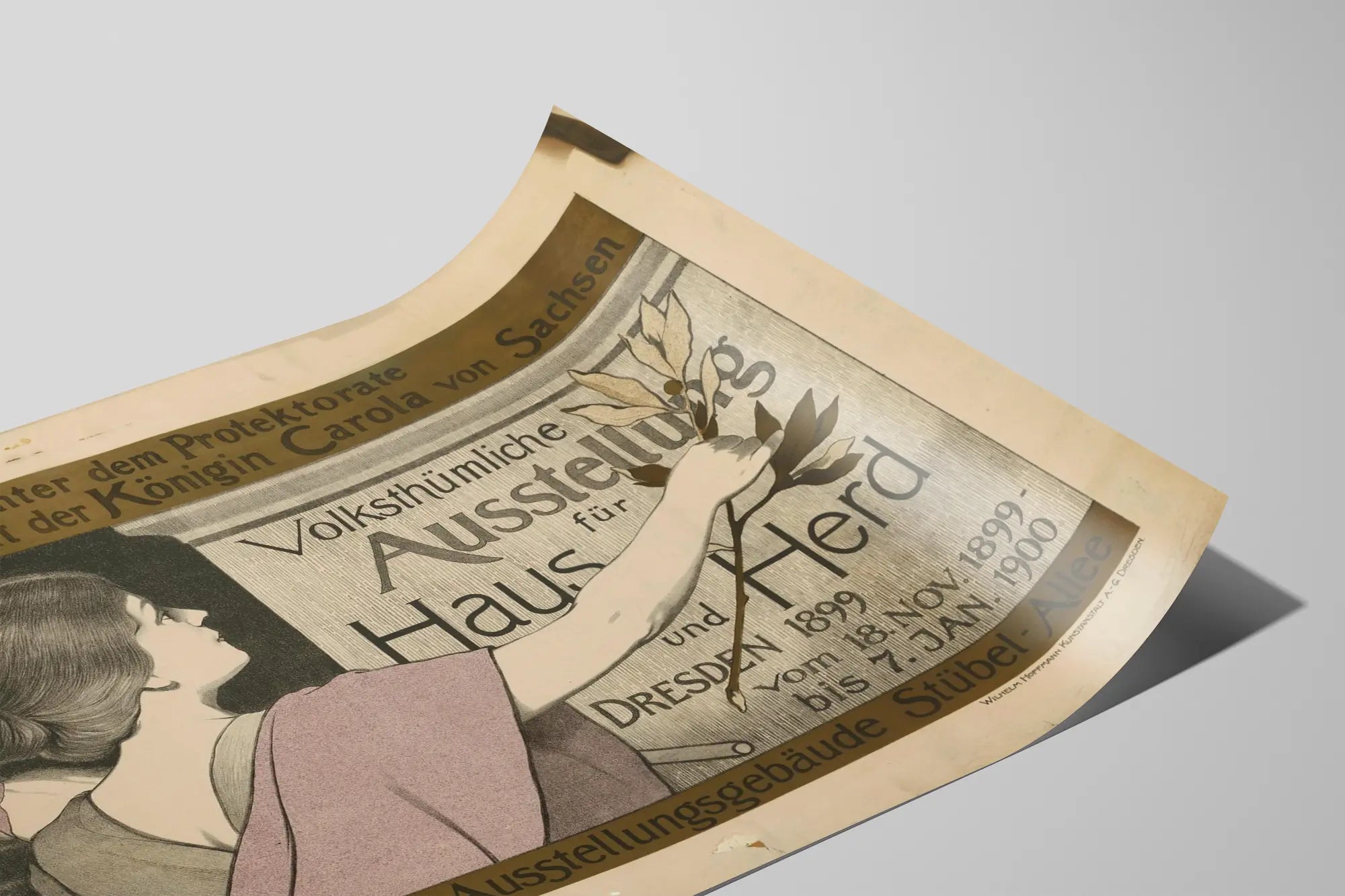 Cette affiche vintage est une représentation graphique remarquable d'une exposition folklorique dédiée à la maison et au foyer, tenue à Dresde en 1899. Elle présente un style typique de la fin du XIXe siècle avec un dessin délicat et des couleurs sobres, principalement des teintes de gris et un violet pâle qui habille la silhouette féminine au centre. La composition met en avant une femme vue de profil, tenant une branche à feuilles stylisée, symbole qui peut évoquer la paix ou la prospérité domestique, soulignant ainsi le thème de la campagne ou de la vie traditionnelle à la maison. Cette décoration murale, sous forme de poster ou d'affiche, est idéale pour enrichir un intérieur qui cherche à mêler charme ancien et ambiance culturelle. Le texte en allemand renforce son authenticité historique, mentionnant l'exposition qui s'est tenue à Dresde du 18 novembre 1899 au 7 janvier 1900, sous la protection de la reine Carola de Saxe. Ce type de tableau mural est parfait pour les amateurs d'arts graphiques anciens, d'histoire allemande ou les passionnés de design vintage. L'affiche se distingue par son équilibre entre illustration et typographie, mettant en valeur le caractère artisan et traditionnel de l'événement. Elle est conçue avec une attention particulière aux détails, notamment dans le rendu des cheveux et des drapés du vêtement de la figure centrale, ce qui en fait une pièce décorative très raffinée. Pour une décoration murale originale, ce poster apporte une touche d'élégance historique à un salon, une bibliothèque ou un bureau. Il s'adapte particulièrement bien dans des intérieurs au style rétro, classique ou éclectique, où chaque élément raconte une histoire. Cette illustration peut aussi être encadrée pour mieux préserver son authenticité et assurer une mise en valeur optimale sur vos murs. Avec ce tableau, vous invitez chez vous une expression artistique et culturelle du passé, riche en symboles et en charme. Cette œuvre est un choix idéal pour ceux qui souhaitent intégrer dans leur décoration murale une pièce unique reflétant le patrimoine et les traditions anciennes.
