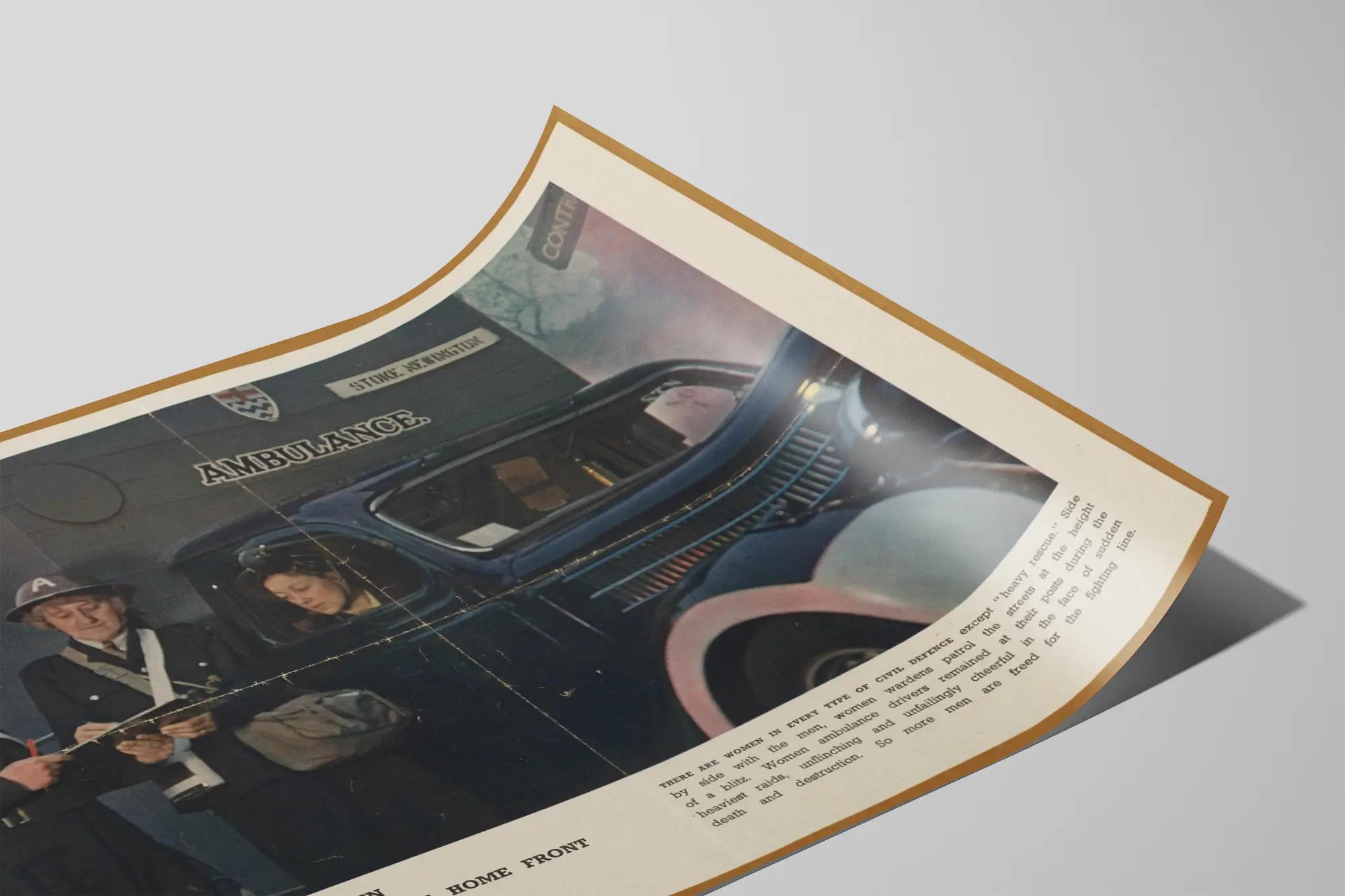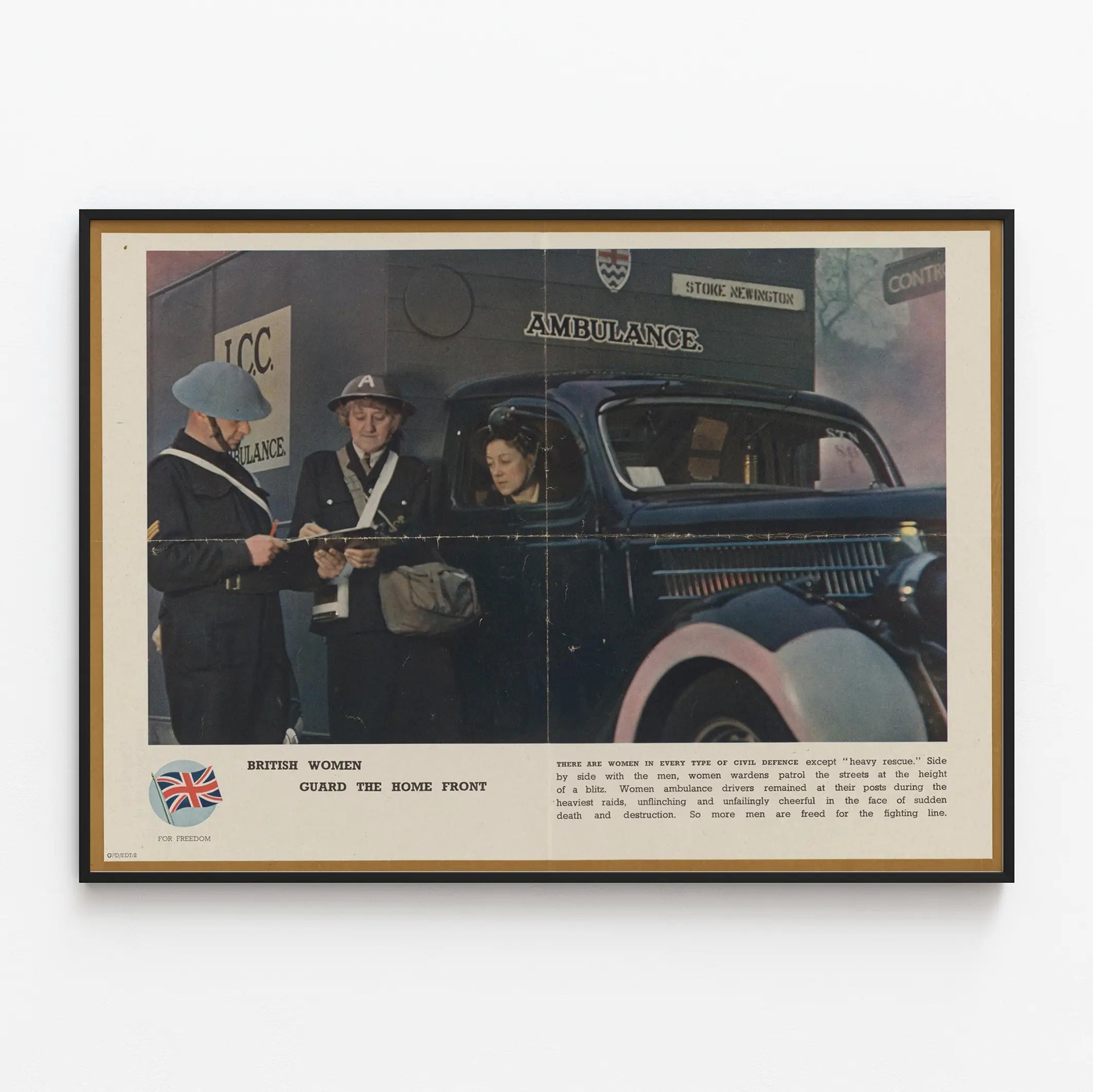 Découvrez cette affiche vintage illustrant des femmes britanniques engagées dans la défense civile lors de la Seconde Guerre mondiale. Ce poster montre trois femmes en uniforme, dont une au volant d'une ambulance, mettant en lumière le rôle crucial des ambulancières et des patrouilles civiles féminines. Cette décoration murale pleine de caractère reflète l’engagement et le courage des femmes qui, aux côtés des hommes, assuraient la sécurité des populations lors des raids aériens. Les détails de ce tableau mural évoquent l’atmosphère et l’histoire de cette époque à travers une scène réaliste et poignante, renforcée par la présence d’une ambulance noire aux lignes classiques. Parfaite pour un intérieur à thème historique ou une collection de posters rétro, cette affiche murale apporte une touche unique et authentique, mêlant décoration et mémoire. Un choix idéal pour les amateurs d’histoire et de décoration murale originale qui souhaitent allier esthétique et symbolique. Ce poster vintage se distingue également par la qualité graphique et les couleurs d’époque, parfait pour sublimer vos murs avec une pièce au fort impact visuel. Intégrer cette affiche à votre décoration murale, c’est inviter un témoignage visuel puissant, une image de la solidarité et du dévouement en temps de guerre.