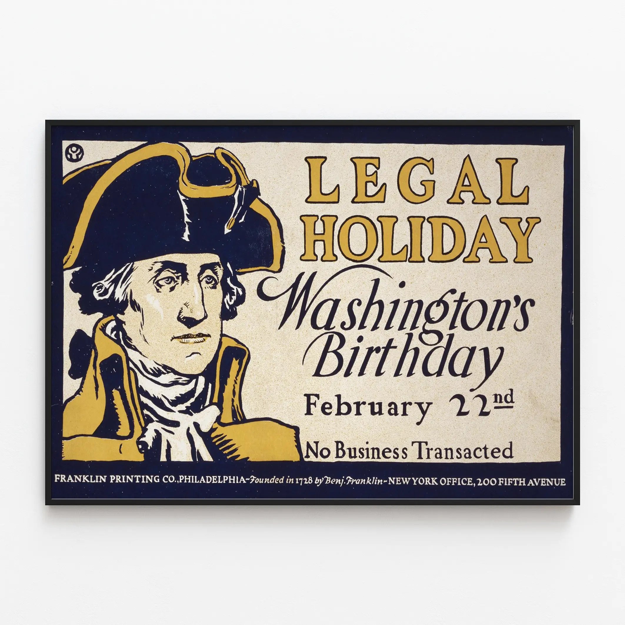 Cette affiche vintage célèbre l'anniversaire de George Washington, une fête légale qui a lieu chaque 22 février. Cette décoration murale au style ancien met en avant le portrait de George Washington, premier président des États-Unis, illustré dans un style graphique distinctif avec des tonalités de jaune et noir. Le texte indique clairement que le 22 février est un jour férié légal, « Legal Holiday », où aucune transaction commerciale n'est effectuée, soulignant l'importance de ce jour de commémoration. Ce poster est une pièce de décoration murale parfaite pour ceux qui souhaitent ajouter une touche d'histoire américaine à leur intérieur. Idéal pour les amateurs de décoration rétro, d'histoire ou de culture américaine, ce tableau mural offre un design unique qui attire le regard. Les couleurs contrastées et la typographie soignée renforcent le charme vintage de cette affiche. Elle peut être utilisée dans différents espaces tels que salons, bureaux, ou salles d'étude pour inspirer et rappeler un moment important du patrimoine américain. Ce poster est un excellent choix pour enrichir une collection d'affiches historiques ou pour offrir un cadeau original à un passionné d'histoire et de décoration. Il s'adapte aussi bien aux intérieurs modernes qu'aux décorations plus classiques, apportant un élément artistique et éducatif, tout en servant de rappel visuel d'une date clé aux États-Unis.