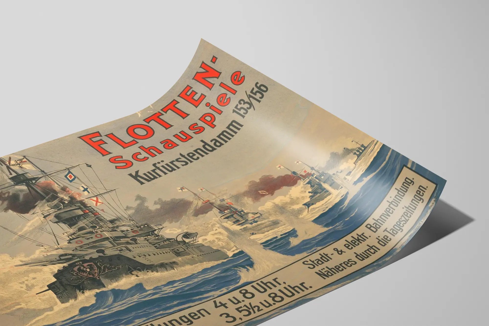 Cette affiche vintage illustre une scène spectaculaire de la flotte militaire en pleine action, avec plusieurs navires de guerre avançant dans une mer agitée. Les détails précis des bâtiments navals, tels que les canons massifs, les cheminées dégageant de la fumée noire et les drapeaux signalant la flotte, attirent immédiatement le regard. Ce poster présente un style artistique typique des affiches publicitaires historiques, marqué par une palette de couleurs sobres et puissantes – des bleus profonds pour la mer, des gris et noirs pour les bâtiments, et des touches de rouge vif pour le texte et certains éléments décoratifs. Le titre « Flotten-Schauspiele » est affiché en haut à droite avec une typographie claire et imposante, renforçant l'aspect militaire et officiel de cette scène navale. L’emplacement « Kurfürstendamm 153/156 » laisse également deviner un contexte urbain et historique, suggérant un événement ou une exposition maritime. En bas de l'affiche, un encart d'information donne des horaires précis en allemand, ce qui ajoute à l'authenticité du document comme matériel promotionnel d’époque. Cette décoration murale est idéale pour une ambiance vintage ou industrielle, particulièrement adaptée aux passionnés d’histoire militaire, de marine, ou aux amateurs d'art graphique ancien. Que ce soit sous forme d’affiche ou de poster encadré, ce visuel marie esthétique et récit historique, faisant rayonner chaque intérieur d’une touche d’aventure navale et de puissance. Simple à intégrer dans une décoration murale, elle s’accordera autant avec un style moderne qu’avec un décor de bureau ou de salon. Ce tableau visuel invite à plonger dans une époque où la marine jouait un rôle central dans les ambitions nationales, sublimant ainsi toute pièce avec une évocation forte et élégante.