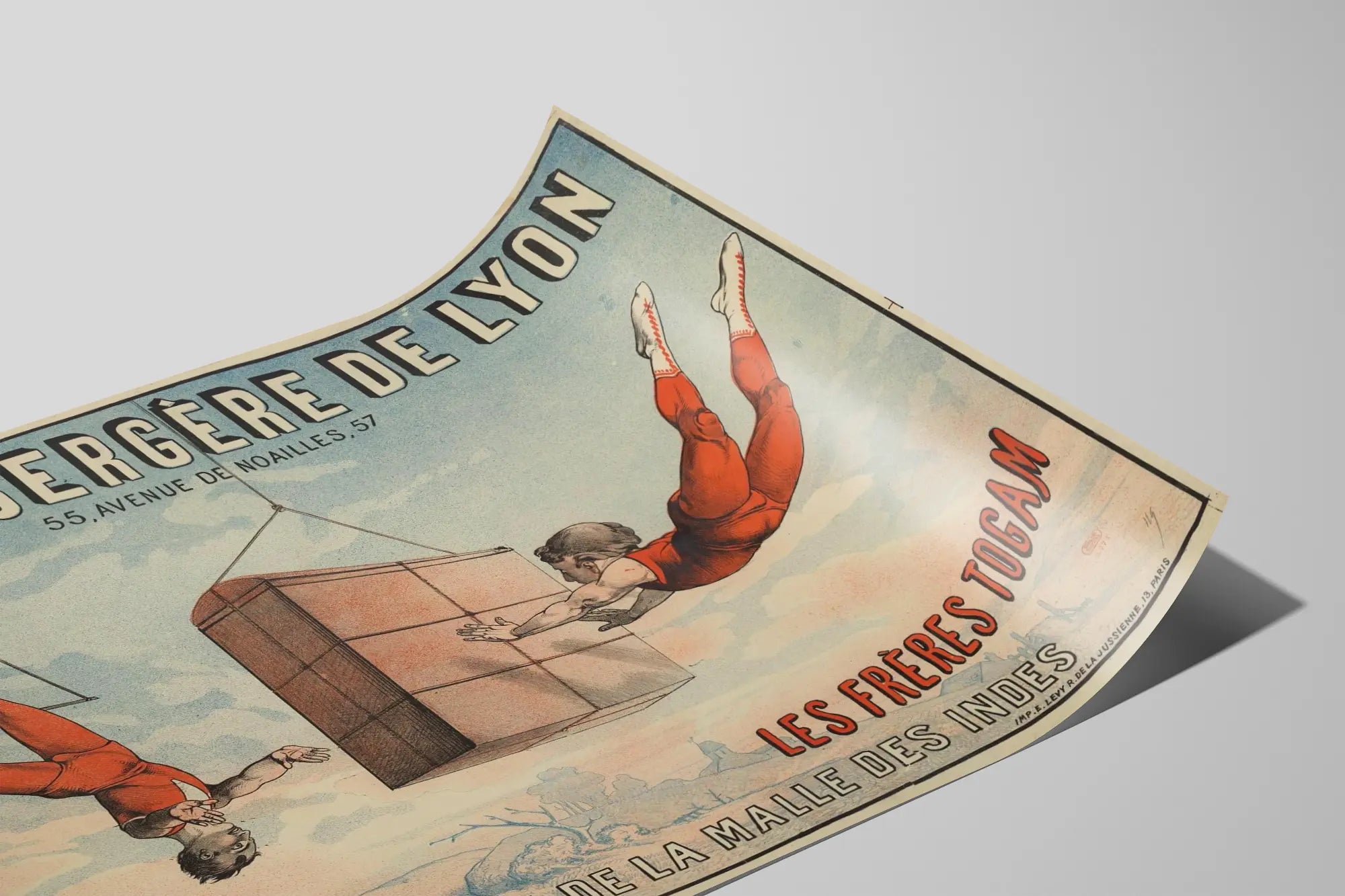 Découvrez cette affiche vintage unique intitulée "Folies-Bergère de Lyon" représentant un spectacle des Frères Togam intitulé "La Traversée de la Malle des Indes". Cette affiche artistique présente deux acrobates en pleine action, évoluant dans un ciel bleu clair parsemé de nuages, suspendus à des cordes. Les artistes portent des tenues rouges vives, accentuant leur mouvement et leur agilité. Ce poster ancien mêle un style graphique remarquable à une mise en scène captivante, évoquant l'univers du cirque et des spectacles de variété. Cette décoration murale est idéale pour les amateurs d'affiches vintage, les passionnés de spectacles et d'acrobaties ou toute personne souhaitant ajouter une touche d'histoire et d'énergie à son intérieur. Ce tableau décoratif met en valeur le charme intemporel des arts du spectacle et s'adapte parfaitement aux styles de décoration classiques ou éclectiques. L'affiche comprend un texte en français indiquant l'adresse "55, avenue de Noailles, 57" ainsi que les mentions "Tous les soirs" et le nom des artistes "Les Frères Togam", renforçant l'authenticité et l'esprit de ce visuel d'époque. La composition met également en scène une grande malle suspendue, ajoutant une dimension narrative à cette œuvre de décoration murale. Ce poster sera une pièce maîtresse dans une galerie murale ou un espace dédié à l'art et la culture, particulièrement dans un salon, une salle de spectacle ou un bureau. En affichage encadré ou en poster libre, il apporte une ambiance dynamique et ludique à votre décoration d'intérieur. Choisissez cette affiche vintage Folies-Bergère de Lyon pour une décoration murale pleine de caractère, célébrant la performance et la créativité des Frères Togam dans un style graphique et historique impressionnant.