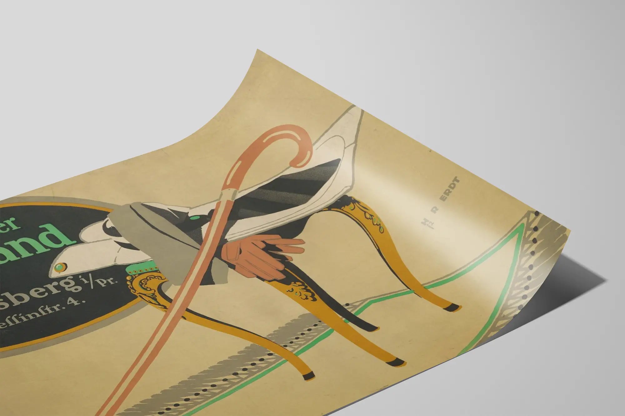 Découvrez cette affiche vintage originale intitulée « Gebrüder Hochland Königsberg Prinzessinstr. 4 », une pièce unique pour votre décoration murale qui allie élégance et charme rétro. Cette affiche publicitaire met en scène une composition sobre et raffinée avec un élégant fauteuil doré à motifs verts, sur lequel sont posés des accessoires masculins classiques : un chapeau blanc, une paire de gants marron et une canne beige à manche courbé. Ces objets rappelant la mode du début du XXe siècle apportent une touche de nostalgie à votre intérieur. Le fond de teinte beige claire accentue le style ancien tout en mettant bien en valeur le texte en vert et blanc sur fond noir : « Gebrüder Hochland » avec l'adresse « Königsberg i/Pr. Prinzessinstr. 4 », suggérant l’origine et la période historique de ce poster. Signée en bas à droite par H. Erdt, cette affiche est un excellent choix pour les amateurs de décoration murale vintage et de design graphique d’époque. Ce poster peut trouver sa place dans un salon, un bureau ou une bibliothèque, en tant que tableau mural qui raconte une histoire et invite à la découverte. Sa composition équilibrée fait de cette affiche un élément décoratif idéal pour créer une ambiance classique et distinguée. Que vous soyez passionné par l'art décoratif ancien ou par le style rétro, cette affiche publicitaire vous permettra d'ajouter une touche historique et artistique à vos murs. En l'accompagnant d'autres éléments de décoration vintage, elle contribuera à un décor chaleureux et authentique. Disponibles en impression de qualité, ce type d'affiche ancienne se prête parfaitement à une décoration murale moderne tout en conservant le charme intemporel des objets et graphismes d’antan.