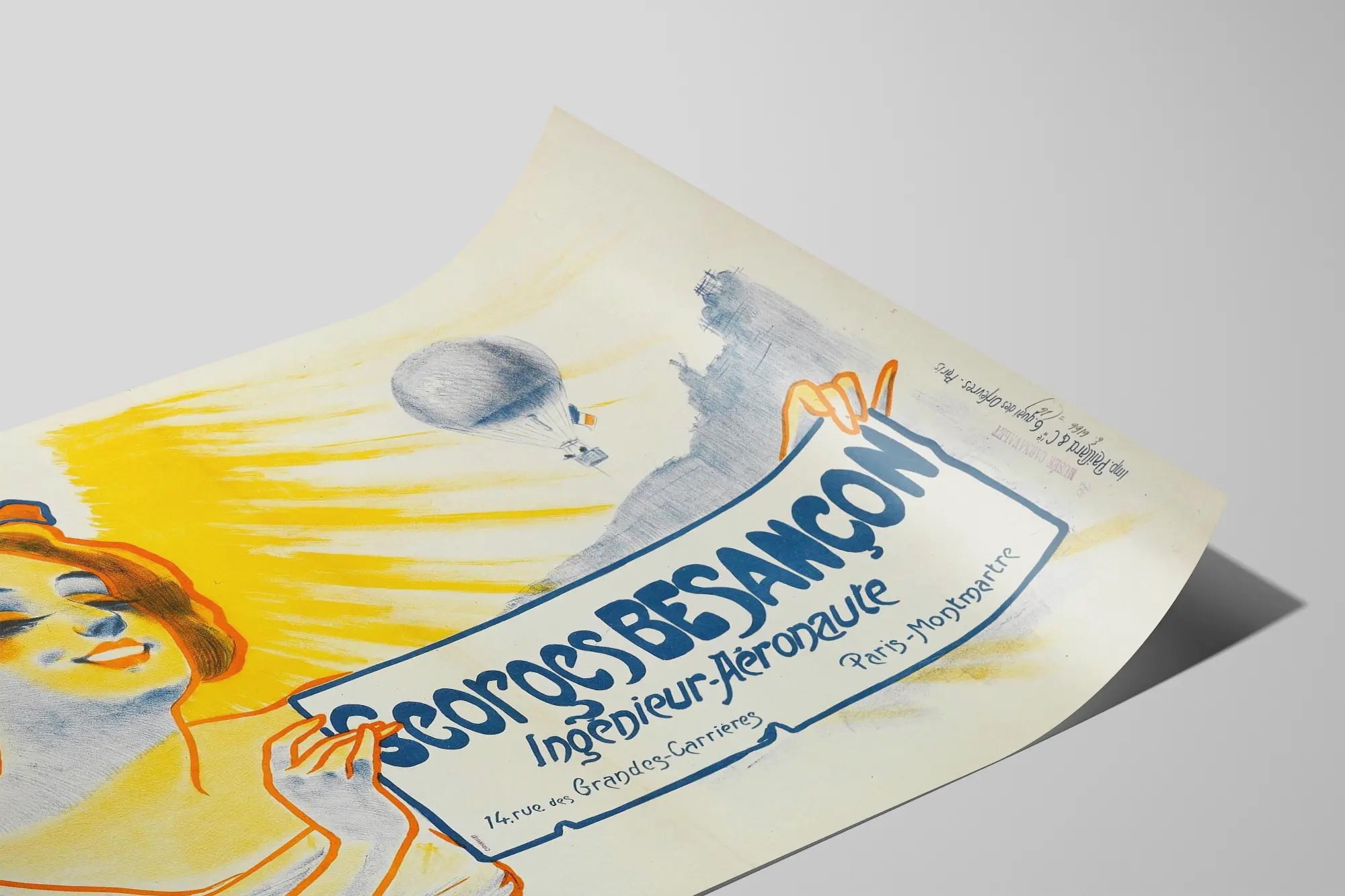Cette affiche vintage met en avant Georges Besançon, ingénieur et aéronaute, avec une illustration artistique et originale typique du début du XXe siècle. On y voit une figure féminine souriante, habillée dans un style ancien, tenant un panneau indiquant le nom et la profession de Georges Besançon. Le fond clair est dynamisé par des rayons jaunes évoquant le soleil, qui éclairent aussi un ballon dirigeable en vol, symbole de l'aéronautique de l'époque. Sur la droite, on distingue une silhouette architecturale, probablement une vue de Montmartre à Paris, rappelant l'adresse indiquée au bas de l'affiche : 14 rue des Grandes-Carrières, Paris-Montmartre. Ce poster de décoration murale se distingue par ses couleurs chaudes orange et jaune contrastant avec le bleu-gris du ballon et des contours. Cette alliance de couleurs offre une ambiance lumineuse qui attire le regard et évoque la modernité de l'ingénierie aéronautique tout en restant ancrée dans une esthétique artistique rétro. Ce type d'affiche est parfait pour embellir un intérieur, qu'il s'agisse d'un bureau, d'un salon ou d'un atelier, en apportant une touche originale et historique liée à l'aéronautique et au Paris ancien. En tant que décoration murale, ce tableau affiche un charme nostalgique qui plaira aux passionnés d'histoire, de design vintage et d'aéronautique. Il se prête aussi parfaitement pour un cadre d'exposition thématique autour des pionniers du vol ou du patrimoine parisien. Le style graphique signé apporte une touche artistique et authentique, valorisant la richesse visuelle et culturelle de ce poster. Idéal pour les amateurs d'affiches anciennes et pour ceux cherchant une décoration murale élégante, ce poster évoque les débuts de l'aéronautique avec un design audacieux et coloré. Il capture un moment de l'histoire technique et artistique à travers une composition harmonieuse entre le personnage, le texte et les éléments aéronautiques. Cette affiche constitue une pièce décorative forte qui donnera caractère et originalité à tout espace intérieur.