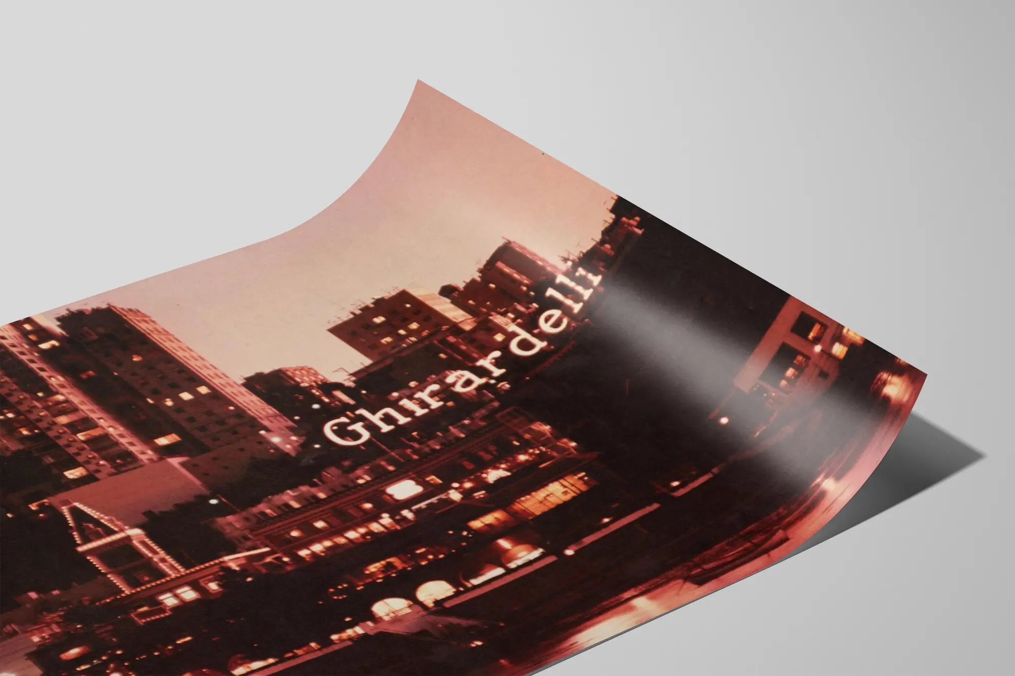 Découvrez cette affiche vintage capturant la silhouette emblématique de Ghirardelli Square à San Francisco au moment du crépuscule. Cette décoration murale met en avant l'enseigne lumineuse "Ghirardelli" qui domine la scène urbaine, nichée au cœur d'un ensemble architectural composé de bâtiments anciens et modernes. L'éclairage tamisé et les reflets orangés diffusés par les lumières de la ville et du ciel créent une ambiance chaleureuse et nostalgique, idéale pour un intérieur qui cherche à évoquer un charme rétro et citadin. Ce poster mural est parfait pour les amateurs de décoration d'intérieur souhaitant intégrer une pièce unique et évocatrice de la célèbre ville californienne. Que ce soit pour un salon, un bureau ou un espace créatif, cette image apportera une touche d'authenticité et de voyage. La composition visuelle valorise l'architecture en contre-jour tout en mettant en lumière le nom iconique, offrant un bel équilibre visuel. Ce tableau peut aussi parfaitement s'intégrer dans une collection d'affiches de paysages urbains ou de destinations américaines, enrichissant votre décoration murale d'un soupçon d'histoire et de caractère. Apportez une touche d'élégance et de mystère à votre pièce avec ce poster qui sublime la magie d'un quartier mythique sous les premières lumières de la nuit.
