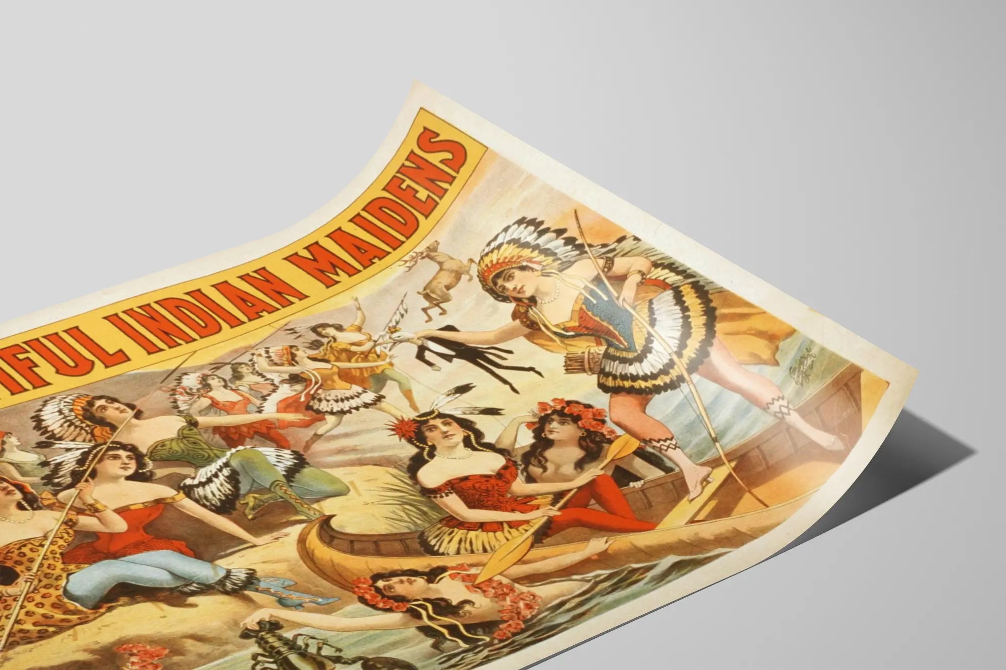 Poznaj tę vintage'ową plakat zatytułowany "Piękne Indianki", urzekającą dekorację ścienną w stylu retro. Ten kolorowy plakat przedstawia liczne młode kobiety ubrane w kostiumy inspirowane klasycznymi strojami rdzennych Amerykanów, ozdobione piórami i tradycyjnymi akcesoriami, w bogatej i dynamicznej kompozycji. Ilustracja ukazuje grupę tych młodych kobiet w różnych pozach i aktywnościach, niektóre wiosłujące w łodzi, inne na brzegu lub w wodzie, wszystkie zgromadzone w wyobrażonym świecie łączącym naturę i folklor. Ten obraz na ścianę jest idealny, aby dodać odrobinę oryginalności i historii do Twojego wnętrza, odwołując się do nostalgii i estetyki dawnych plakatów reklamowych. Dzięki ciepłym barwom i drobiazgowym detalom, ta dekoracja ścienna doskonale pasuje do salonu, biura lub pokoju rekreacyjnego, tworząc vintage'ową i artystyczną atmosferę. Ten plakat to element dekoracyjny, który zachwyci miłośników starej grafiki, motywów etnicznych i scen naturalistycznych.