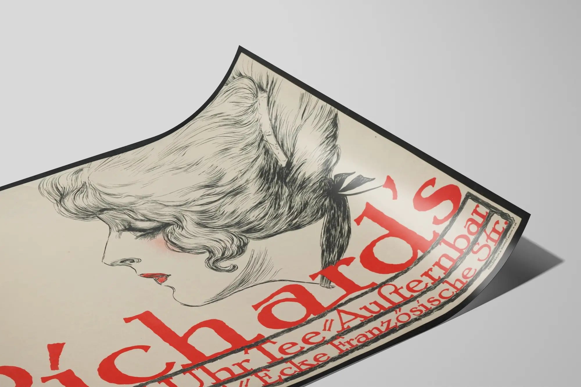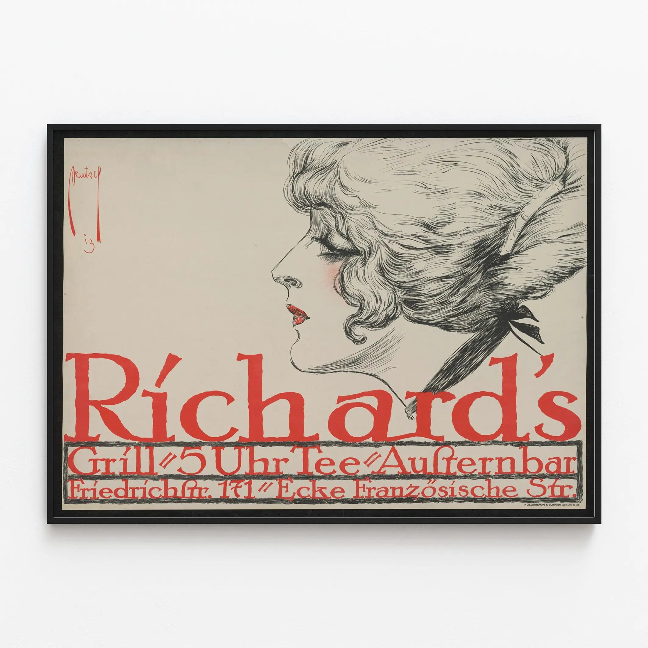 Czerwony, żywy tekst umieszczony na dolnej części plakatu dodaje silnego wymiaru typograficznego. Słowo „Richards” pojawia się dużymi literami, a następnie uzupełniające informacje o ewentualnym miejscu lub wydarzeniu: Grill, 5 Uhr Tee, Au Sternbar, Friedrichstr. 171, Ecke Französische Str. Ta kompozycja łączy tekst i ilustrację w stylu graficznym przypominającym stare plakaty reklamowe, co czyni ją idealną do retro lub vintage'owej dekoracji ściennej.