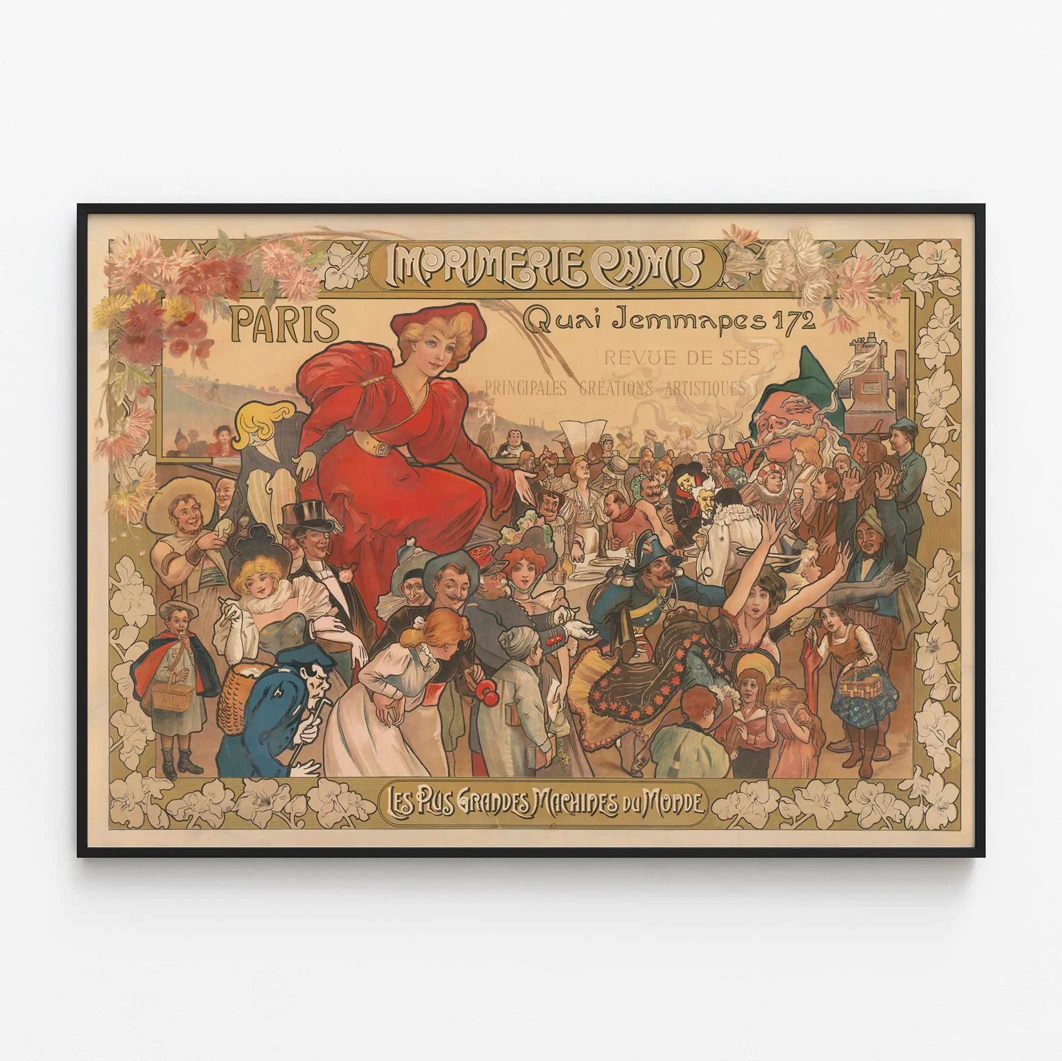 Ta oryginalna, vintage plakat z drukarni Camis, zlokalizowanej przy Quai Jemmapes 172 w Paryżu, jest prawdziwym dziełem dekoracji ściennej, odzwierciedlającym sztukę graficzną tamtej epoki. Ukazuje tłum pełen życia i kolorów wokół kobiecej postaci w czerwonej sukni, symbolizując ducha artystycznego i świątecznego głównych dzieł drukarni. Ten stary plakat ścienny, bogaty w szczegóły i ilustracje, przedstawia scenę popularną, w której mieszają się postacie w kostiumach, dzieci i dorośli, tworząc żywy i dynamiczny obraz. Otoczony kwiatowymi motywami w pastelowych odcieniach, wnosi urok i autentyczność do każdego wnętrza o stylu retro i eleganckim. Ten delikatnie postarzały plakat może upiększyć salon, biuro lub przestrzeń twórczą, oferując unikalne wizualne świadectwo historii druku i reklamy paryskiej. Jego przyjazna i artystyczna atmosfera zachęca do nostalgii, jednocześnie podkreślając wyrazisty wybór dekoracyjny, idealny dla miłośników oryginalnych dekoracji ściennych i pasjonatów starej sztuki graficznej.