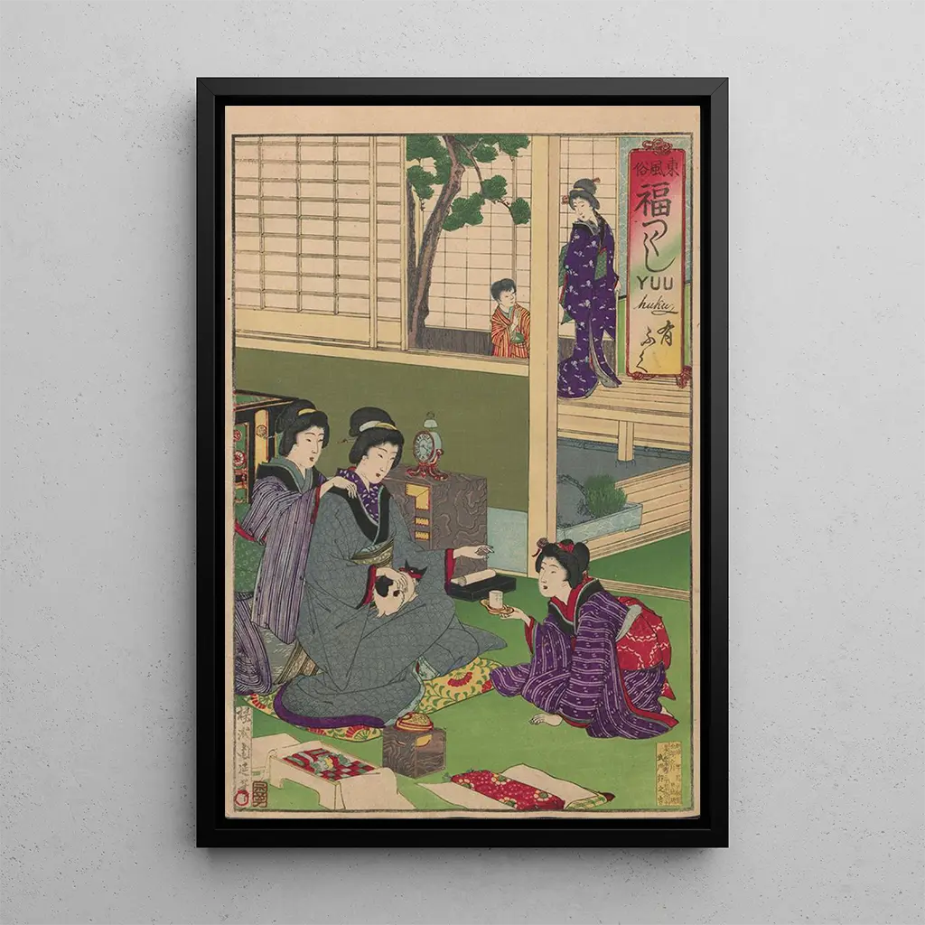 "Album Nishikie Pl06" autorstwa Toyohara Chikanobu to dzieło, które celebruje efemeryczną piękność sezonów i japońskich tradycji. Żywe kolory i delikatne motywy łączą się, tworząc żywą scenę, w której każdy szczegół wydaje się opowiadać historię. Technika drzeworytu, opanowana przez Chikanobu, zapewnia niezwykłą precyzję i głębię wizualną, która przyciąga wzrok. Ta reprodukcja wywołuje atmosferę spokoju, zachęcając do kontemplacji i ucieczki w świat pełen poezji.