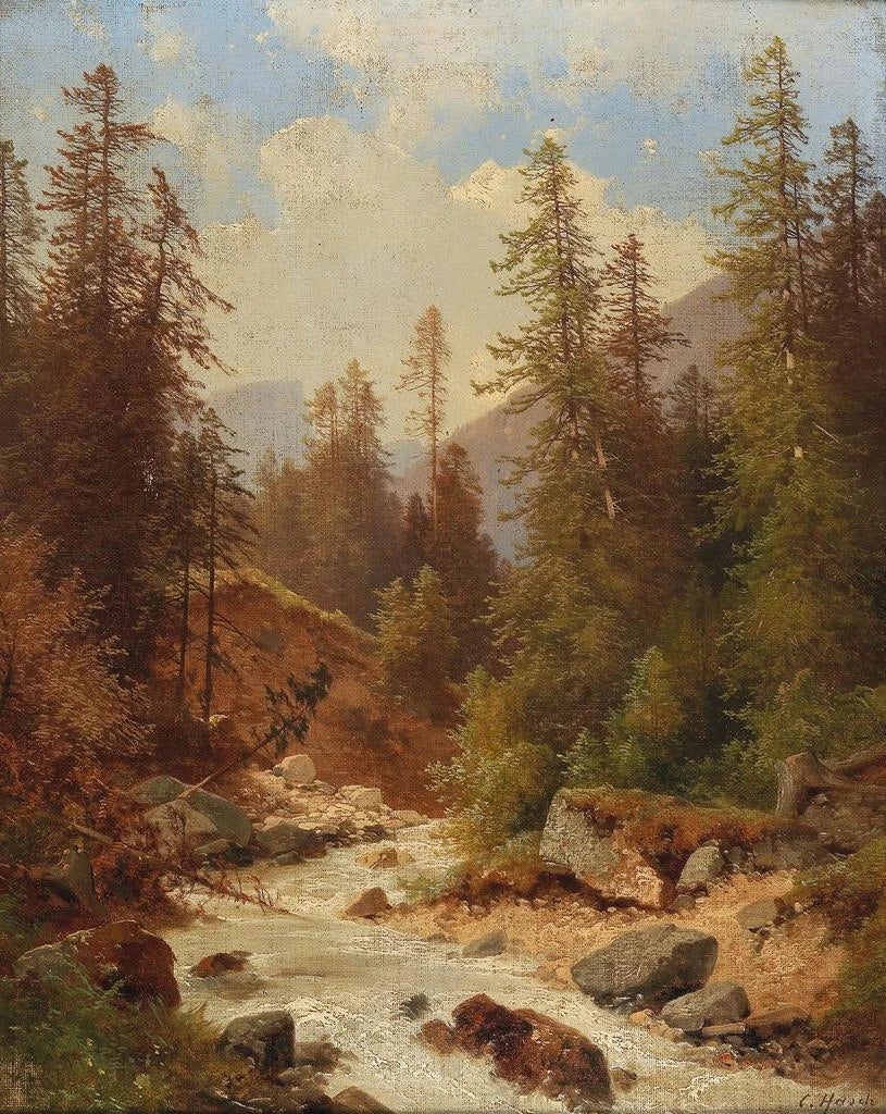 Styl Carla Hascha wyróżnia się finezją i dbałością o szczegóły. W "Am Seebach à Prague" artysta używa palety delikatnych kolorów, łącząc subtelne odcienie zieleni i błękitu, aby oddać spokój popołudnia nad wodą. Pociągnięcia pędzla, zarówno precyzyjne, jak i płynne, nadadzą każdemu elementowi sceny namacalną żywość. Drzewa, majestatyczne i opiekuńcze, zdają się szeptać sekrety na wiatr, podczas gdy woda, o olimpijskim spokoju, odzwierciedla otaczające piękno. Hasch potrafi uchwycić moment natury, w którym czas zdaje się zatrzymać, tworząc atmosferę pokoju i kontemplacji. Ten obraz to zaproszenie do marzeń, gdzie każdy spojrzenie odsłania nowe odcienie i szczegóły, czyniąc doświadczenie jego kontemplacji nieskończonym i wzbogacającym.