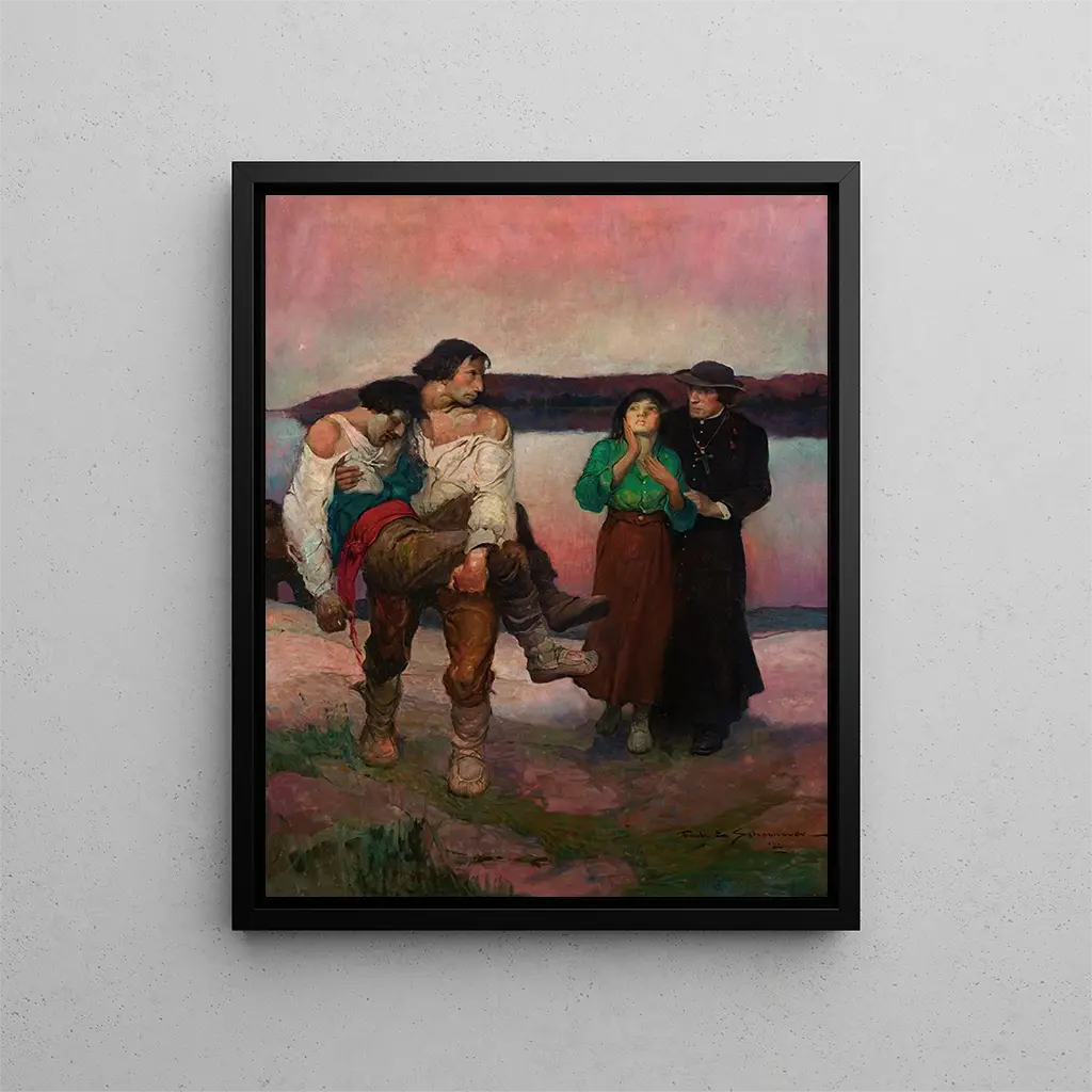 Reproduction Amant blessé - Frank Earle Schoonover – Wciągające wprowadzenie W obfitym świecie sztuki niektóre dzieła potrafią uchwycić istotę ludzkich emocji. "Amant blessé" Franka Earle Schoonovera jest tego doskonałym przykładem. To dzieło, które wywołuje zarówno pasję, jak i ból, rozgrywa się przed oczami widza niczym scena wyjęta z marzenia lub odległej wspomnienia. Schoonover, poprzez tę kreację, zaprasza nas do zgłębienia głębi ludzkiej duszy, łącząc czułość z melancholią w bogatej w kolory i niuanse kompozycji. Dzieło nie ogranicza się do przedstawienia sceny; zanurza nas w wizualnej opowieści, gdzie każdy spojrzenie, każdy gest opowiada unikalną historię. Styl i wyjątkowość dzieła Styl Schoonovera odznacza się rzadką delikatnością, łącząc realizm z impresjonizmem w subtelnej harmonii. "Amant blessé" wyróżnia się odważnym użyciem światła i cienia, tworząc atmosferę zarówno intymną, jak i dramatyczną. Postacie, starannie szczegółowe, wydają się niemal żywe, ich emocje są namacalne i uniwersalne. Paleta kolorów wybrana przez artystę, oscylująca między ciepłymi odcieniami a chłodniejszymi niuansami, wzmacnia kontrast między radością a smutkiem, między miłością a stratą. Każdy pociąg pędzla, każdy drobny szczegół, przyczynia się do podniesienia tego dzieła do rangi wizualnej ikony, dzieła, które nie pozostawia nikogo obojętnym i które przy każdej kontemplacji odsłania nowe oblicza swojej treści. Artysta i jego wpływ Frank Earle Schoonover, wybitna postać początku XX wieku, odcisnął piętno na swojej epoce dzięki nowatorskiemu podejściu i wyczuciu narracji wizualnej. Wykształcony w prestiżowej szkole sztuk pięknych, był pod wpływem wielkich mistrzów, jednocześnie rozwijając własny styl. Jego zdolność do uchwycenia ludzkich emocji i przekształcania ich w obrazy uczyniła go niekwestionowanym artystą, zarówno w dziedzinie ilustracji, jak i malarstwa. Schoonover był także gorącym obrońcą natury, często wplatając w swoje dzieła elementy naturalne, co świadczy o jego głębokim szacunku dla