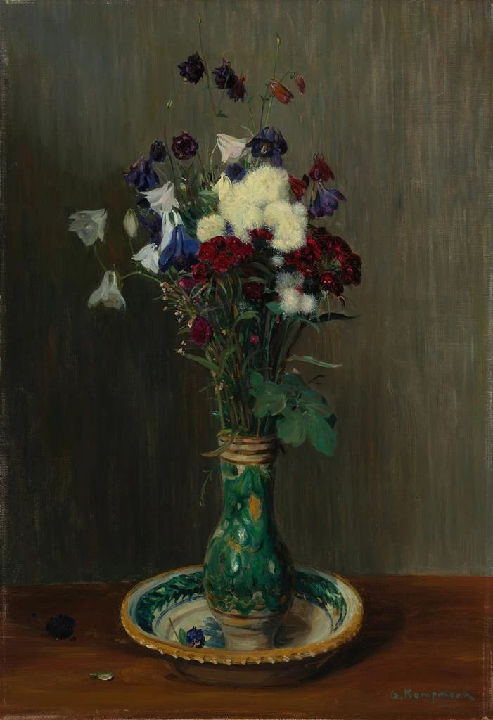 Gustav Kampmann, aktywny na początku XX wieku, jest duńskim malarzem znanym z kompozycji florystycznych. Pod wpływem impresjonizmu, potrafił uchwycić światło i kolor w sposób, który odzwierciedla piękno natury. Jego kariera, choć mniej znana niż niektórych jego współczesnych, pozostawiła trwały ślad w świecie sztuki florystycznej. Kampmann często eksplorował tematy życia i śmierci, używając kwiatów jako symboli efemerycznej piękności. Jego obrazy, jak ta reprodukcja, świadczą o jego talencie do uwieczniania ulotnych chwil.