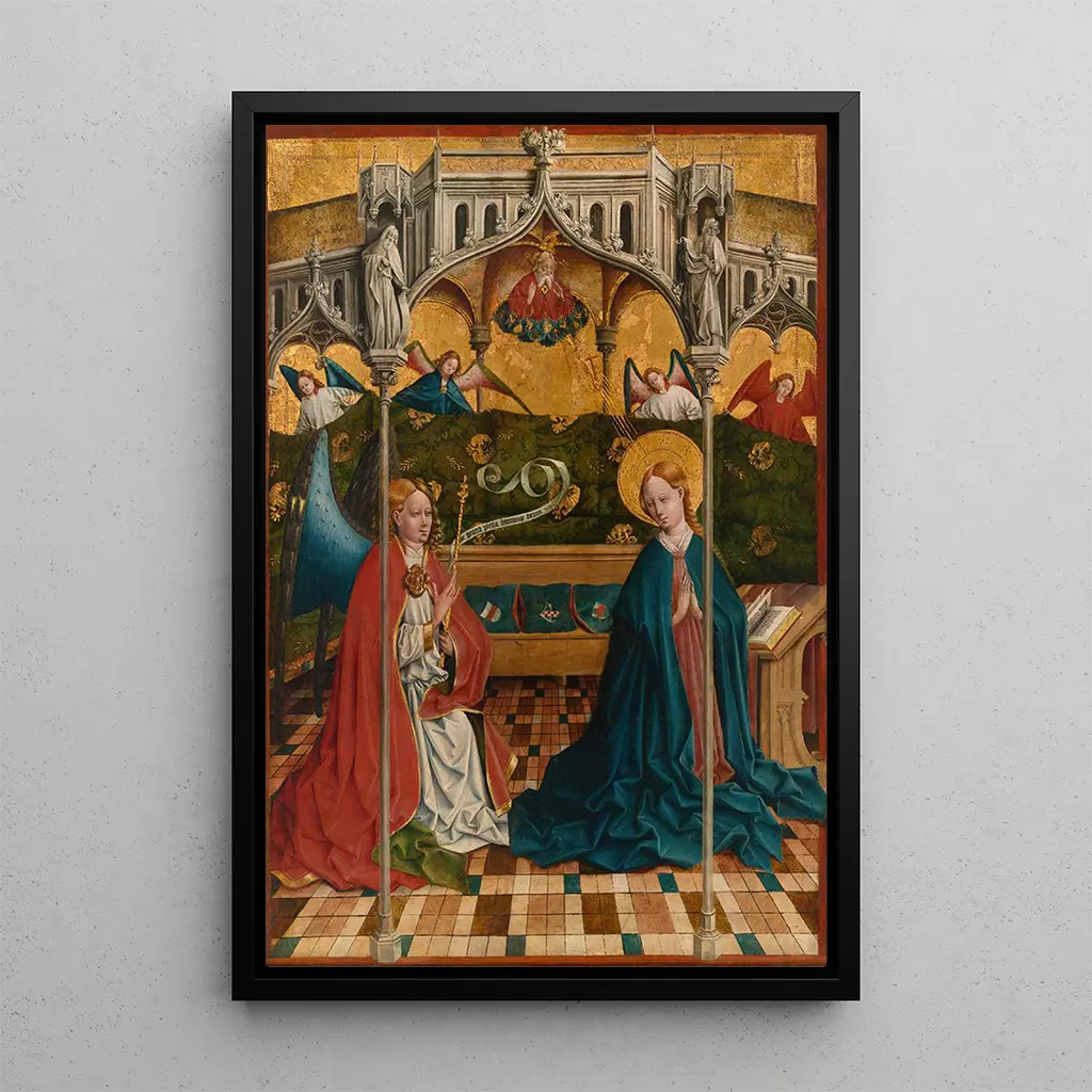 La reproduction de "L'Annonciation" de Johann Koerbecke capture un instant de profonde spiritualité où l'ange Gabriel annonce à la Vierge Marie qu'elle concevra le Fils de Dieu. Cette œuvre, réalisée avec une technique minutieuse, se caractérise par des couleurs riches et des détails délicats. Les expressions des personnages, à la fois étonnés et sereins, transmettent une émotion palpable. L'arrière-plan, souvent orné de motifs symboliques, renforce l'atmosphère mystique de la scène, invitant le spectateur à ressentir la gravité et la beauté de cette annonce divine.