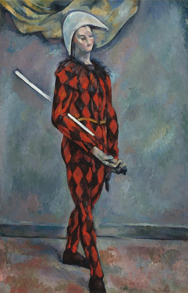 „Arlequin” jest ikonicznym dziełem Paula Cézanne'a, które przedstawia postać w kolorowym kostiumie, ucieleśniającą słynnego bohatera commedia dell'arte. Obraz wyróżnia się żywą paletą barw, gdzie intensywne odcienie przenikają się, tworząc zabawną i dynamiczną atmosferę. Cézanne używa form geometrycznych do strukturyzacji postaci, zachowując jednocześnie pewną płynność ruchów. Tło, bardziej stonowane, pozwala wyeksponować Arlequina, którego fascynujące spojrzenie zdaje się zapraszać widza do wejścia w jego świat. To dzieło jest celebracją koloru i formy, typową dla stylu Cézanne'a.