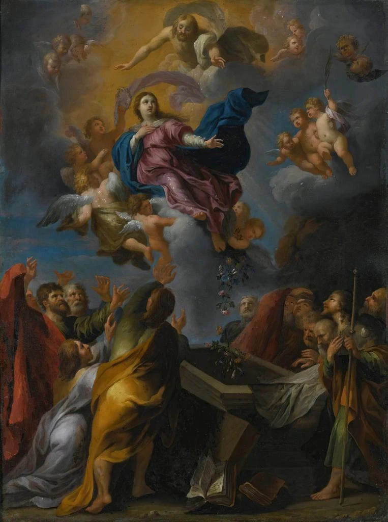 Objęcie Najświętszej Maryi Panny wyróżnia się odważną kompozycją i mistrzowskim użyciem światła. Postacie, rzeźbiarskie i wyraziste, zdają się tańczyć na niebie, tworząc płynny ruch, który kieruje wzrok ku szczytowi dzieła. Sposób, w jaki światło oświetla twarze apostołów, świadków tego świętego momentu, wzmacnia ideę boskiej transcendencji. Draperia ubrań, starannie opracowana, ukazuje realizm kontrastujący z idealizacją postaci. Paleta, składająca się z ciepłych i złotych odcieni, przywołuje ciepło boskiego światła, podczas gdy odcienie niebieskiego i białego symbolizują czystość Maryi. Każdy szczegół, każdy pociągnięcie pędzla, przyczynia się do wizualnej narracji, która przekracza zwykły obraz, stając się prawdziwym doświadczeniem duchowym.