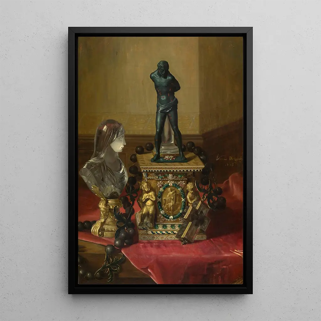 Druk artystyczny Au Louvre autorstwa Blaise-Alexandre Desgoffe przenosi nas do świata, w którym piękno ukrywa się w szczegółach codziennych. To fascynujące dzieło wyróżnia się harmonijną kompozycją, w której przedmioty codziennego użytku są podkreślane z niezwykłą delikatnością. Ciepłe i bogate kolory, od głębokich brązów po olśniewające złocenia, tworzą atmosferę zarówno intymną, jak i przytulną. Technika malarstwa olejnego, opanowana przez Desgoffe, pozwala oddać każdą teksturę z oszałamiającą precyzją, zachęcając widza do docenienia piękna prostych rzeczy. Ten obraz to prawdziwa oda do kontemplacji, gdzie każdy element opowiada własną historię.