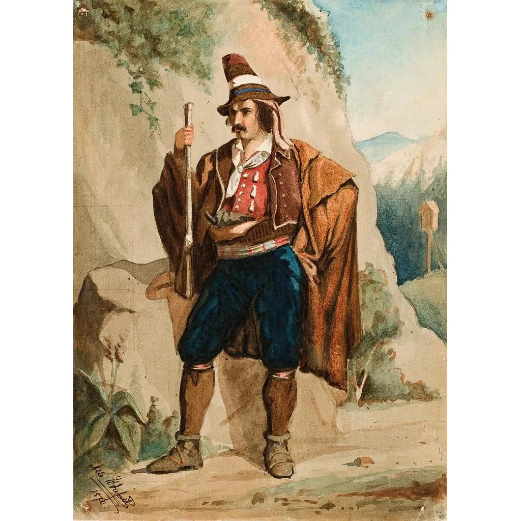 W "Bandit włoski" Albert Edelfelt uchwycił intensywny moment życia, w którym postać, ikona kultury włoskiej, stoi dumnie, otoczona atmosferą pełną emocji. Ciepłe, ziemiste kolory, połączone z akcentami światła, ożywiają tę scenę, podczas gdy szczegóły stroju postaci dodają głębi dziełu. Technika Edelfelta, łącząca realizm i ekspresję, pozwala odczuć siłę i determinację tego protagonisty, czyniąc z tej druk artystyczny prawdziwe narracyjne dzieło sztuki.