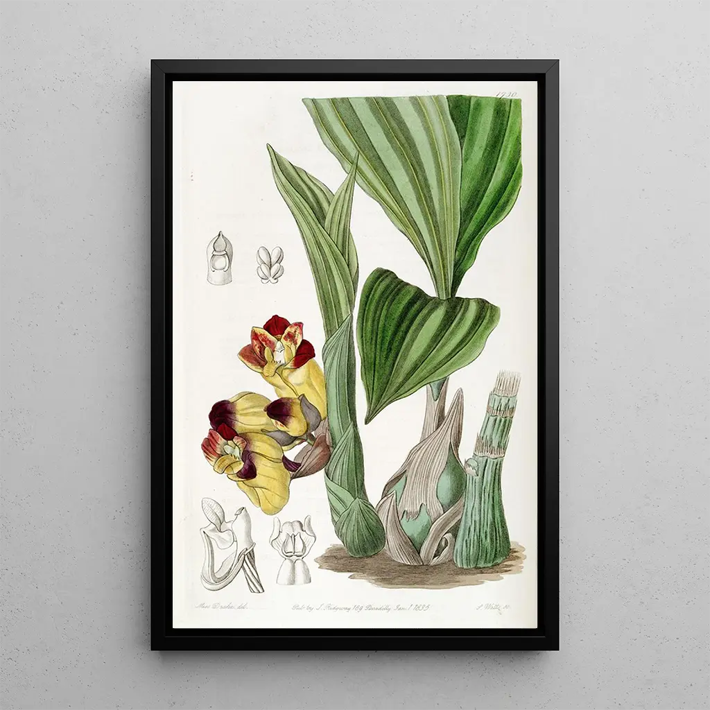 Druk artystyczny BarrelOrchis bicolore to celebracja rzadkości i elegancji. Jego kwiaty, o kontrastowych odcieniach żółci i fioletu, dumnie się wyprostowują, przyciągając wzrok swoją wyjątkową urodą. Technika ilustracji Sydenham Edwards podkreśla każdy szczegół, od delikatnych żyłek płatków po eleganckie kształty liści. To dzieło na płótnie przywołuje żywy, naturalny świat, w którym każdy element zdaje się opowiadać historię, zachęcając widza do podziwiania bogactwa flory.