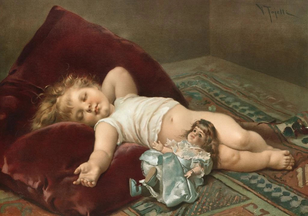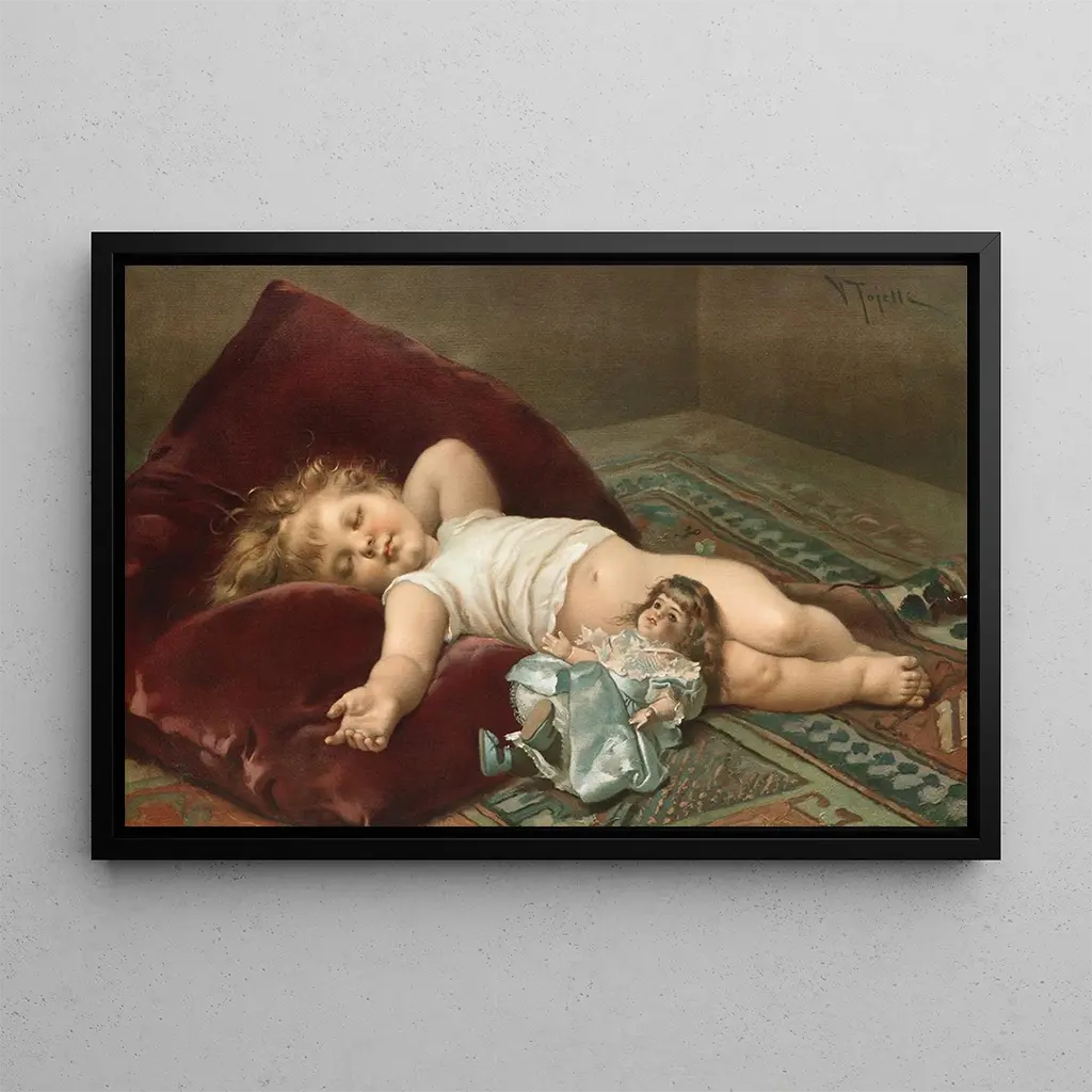 Virgilio Tojetti, włoski malarz XIX wieku, jest znany z scenek rodzajowych i portretów pełnych realizmu. Pod wpływem romantyzmu, potrafił uchwycić intymne i poruszające chwile codziennego życia. Tojetti często przedstawiał dzieci, podkreślając ich niewinność i naturalne piękno. Jego kariera, choć mniej znana niż niektórych współczesnych, pozostawiła trwały ślad w świecie sztuki. "Bébé śpi" jest doskonałym przykładem jego talentu, ukazującym umiejętność uchwycenia ulotnych momentów z dużą głębią emocjonalną.