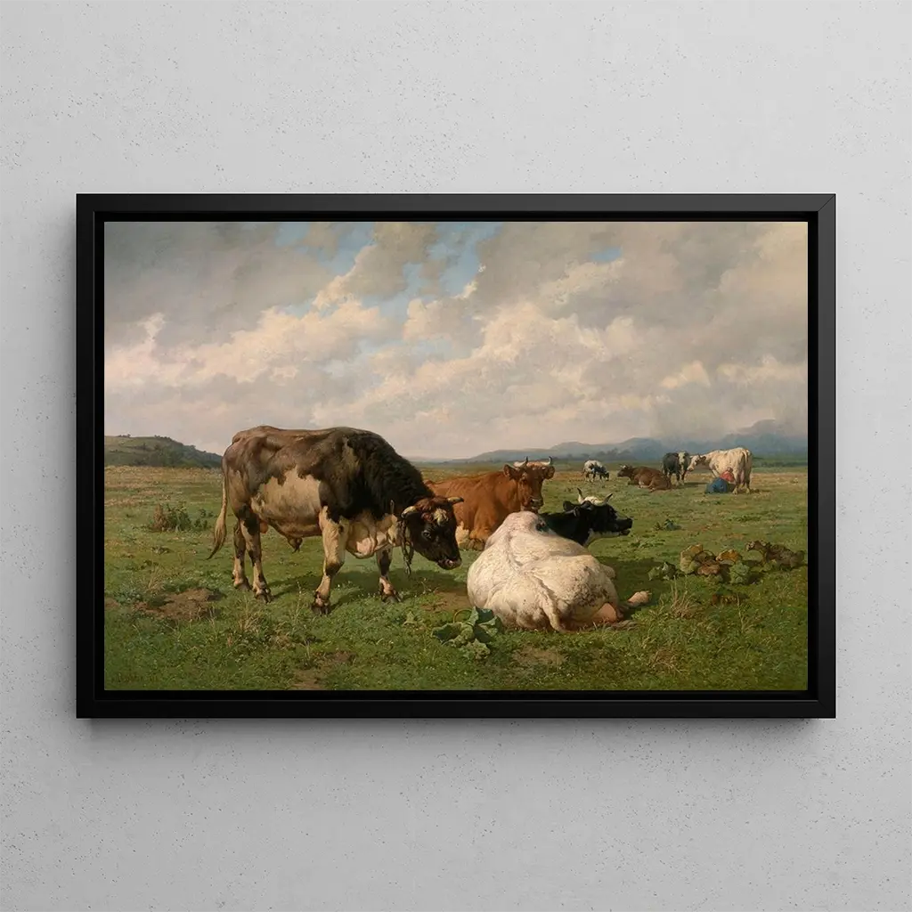 Bétail dans le pré : une scène bucolique empreinte de sérénité Dans cette reproduction de Bétail dans le pré, Louis Robbe nous transporte au cœur d'un paysage pastoral où la nature s'épanouit. Les teintes douces et lumineuses évoquent la lumière du jour, tandis que les animaux paisibles se mêlent harmonieusement à la verdure environnante. La technique de Robbe, qui allie réalisme et impressionnisme, crée une atmosphère apaisante, presque méditative. Chaque détail, des reflets dans l'eau aux ombres des arbres, contribue à une composition équilibrée qui invite à la contemplation et à l'évasion. Louis Robbe : un maître du paysage rural Louis Robbe, peintre français du XIXe siècle, est reconnu pour ses représentations de la nature et des scènes rurales. Influencé par le mouvement réaliste, il s'inscrit dans une époque où l'art cherche à capturer la beauté du quotidien. Ses œuvres, souvent empreintes de poésie, témoignent d'une sensibilité particulière envers le monde naturel. Robbe a su s'imposer comme un artiste majeur de son temps, explorant les nuances de la lumière et des couleurs pour donner vie à ses tableaux. Son héritage perdure, inspirant de nombreux artistes contemporains à redécouvrir la beauté des paysages. Une acquisition décorative aux multiples atouts La reproduction de Bétail dans le pré est une pièce décorative qui saura embellir tout espace, que ce soit un salon, un bureau ou une chambre. Sa qualité d'impression et sa fidélité à l'œuvre originale garantissent un rendu esthétique remarquable. Ce tableau, avec ses couleurs apaisantes et son ambiance sereine, apporte une touche de nature et de tranquillité à votre intérieur. En choisissant cette toile, vous optez pour une décoration qui évoque la simplicité et la beauté des paysages, tout en ajoutant une note artistique à votre environnement.