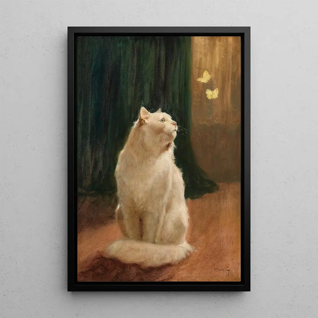 Dans cette œuvre captivante, Arthur Heyer nous invite à plonger dans un univers où la douceur et la légèreté règnent en maîtres. Le chat blanc, avec son pelage éclatant, se dresse avec une grâce naturelle, tandis que les deux papillons citron virevoltent autour de lui, apportant une touche de couleur vive à la composition. Les nuances de jaune et de blanc se marient harmonieusement, créant une atmosphère paisible et rêveuse. La technique de Heyer, qui mêle réalisme et impressionnisme, permet de ressentir la texture du pelage et la fragilité des ailes des papillons, faisant de cette toile un véritable poème visuel.