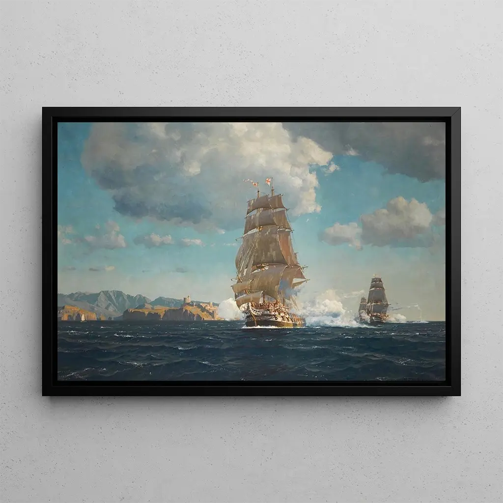Bitwa na morzu: epicki obraz odwagi i strategii "Bitwa na morzu" autorstwa Michaela Zeno Diemera to dzieło, które zanurza widza w sercu intensywnego starcia morskiego. Białe żagle statków dumnie wyrastają na tle burzowego nieba, podczas gdy wzburzone fale dodają scenie dynamicznego charakteru. Ciemne kolory i wyraźne kontrasty podkreślają dramatyczne napięcie bitwy, uchwycając istotę konfliktu morskiego. Technika Diemera, łącząca realizm z romantyzmem, pozwala odczuć energię i ruch tej konfrontacji, czyniąc ten obraz prawdziwym arcydziełem akcji i pasji. Michael Zeno Diemer: wirtuoz ruchu i światła Michael Zeno Diemer, niemiecki malarz XIX wieku, słynie z przedstawień scen morskich i bitew morskich. Zainspirowany romantyzmem, potrafił uchwycić potęgę i majestat morza, jednocześnie wplatając elementy historyczne w swoje dzieła. Jego kariera charakteryzuje się nieustannym poszukiwaniem światła i ruchu, co pozwoliło mu tworzyć obrazy o dużej intensywności wizualnej. Diemer zyskał uznanie w świecie sztuki dzięki zdolności do wywoływania silnych emocji poprzez swoje kompozycje, czyniąc go nieodłączną postacią swojego okresu. Dekoracyjny druk artystyczny o wielu zaletach Reprodukcja "Bitwy na morzu" to odważny wybór dla tych, którzy chcą dodać odrobinę heroizmu do swojego wnętrza. Niezależnie od tego, czy to biuro, salon czy pokój gier, ten obraz przyciąga wzrok i budzi podziw. Jakość reprodukcji zapewnia wierne odwzorowanie szczegółów i kolorów oryginalnego dzieła, pozwalając w pełni docenić potęgę tej sceny. Wprowadzając ten obraz do swojego otoczenia, tworzysz dynamiczną i inspirującą atmosferę, jednocześnie oddając hołd sztuce malarstwa historycznego. Zafunduj sobie ten główny element kolekcji, aby wzbogacić swoją kolekcję i pobudzić wyobraźnię.