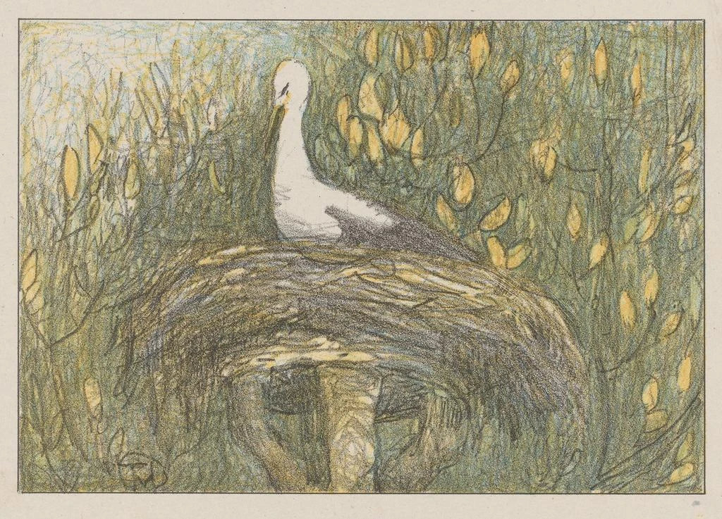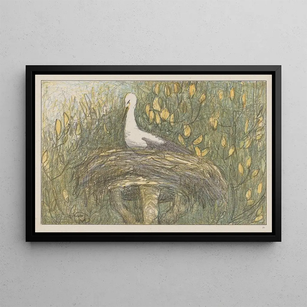 W "Cigogne dans le nid" Theo van Hoytema ukazuje scenę pełną spokoju i delikatności. Obraz przedstawia majestatyczną bocianicę, siedzącą w swoim gnieździe, otoczoną bujną roślinnością. Delikatne kolory, od uspokajających zieleni po ciepłe brązy, tworzą spokojną, niemal kontemplacyjną atmosferę. Technika artysty, łącząca akwarelę i olej, ożywia każdy szczegół, od delikatnych piór ptaka po żywe liście drzew. To dzieło zachęca do chwili wytchnienia, do refleksji nad prostym pięknem natury.