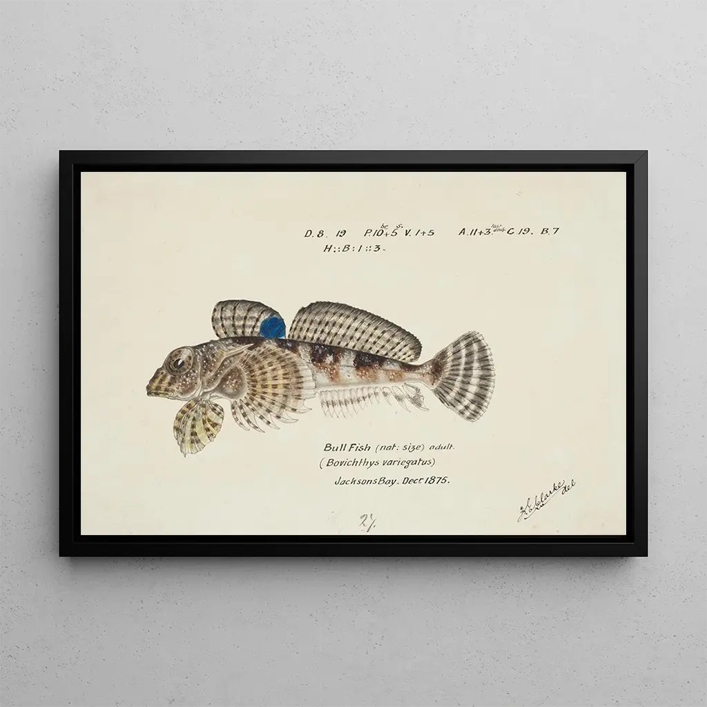 Bovichtus variegatus Ryba kolczasta z Nowej Zelandii: skarb głębin morskich Bovichtus variegatus, ikoniczna ryba kolczasta Nowej Zelandii, jest przedstawiona z niezwykłą precyzją w tym druku artystycznym. Żywe odcienie niebieskiego i zielonego na jej ciele kontrastują z ciemniejszymi tonami jej podwodnego środowiska. Technika Franka Edwarda Clarkea, łącząca realizm z drobiazgowymi detalami, pozwala uchwycić piękno i złożoność tej unikalnej ryby. Każda błyszcząca łuska wydaje się niemal żywa, zapraszając widza do zanurzenia się w fascynujący świat wodny. Frank Edward Clarke: pasjonat przyrody Frank Edward Clarke, artysta i naturalista XX wieku, poświęcił swoją karierę badaniu i przedstawianiu fauny morskiej. Jego prace charakteryzują się naukowym podejściem, ale także artystyczną wrażliwością, która pozwala mu uchwycić istotę swoich tematów. Clarke podróżował po morzach świata, czerpiąc inspirację z różnorodności biologicznej, którą spotykał. Ta reprodukcja Bovichtus variegatus świadczy o jego zaangażowaniu w podnoszenie świadomości o pięknie i kruchości ekosystemów morskich. Dekoracyjny druk artystyczny o wielu zaletach Ta reprodukcja Bovichtus variegatus to element dekoracyjny, który wzbogaci Twoje wnętrze, niezależnie od tego, czy będzie to sala gier, biuro czy sypialnia. Jakość druku i dbałość o szczegóły sprawiają, że ten obraz jest fascynującym dodatkiem do Twojej kolekcji. Estetyczny urok tego dzieła przywołuje cuda oceanu, wprowadzając odrobinę egzotyki i spokoju do Twojej przestrzeni. Podaruj sobie kawałek morskiego piękna, które z pewnością pobudzi rozmowy i zainspiruje podziw.