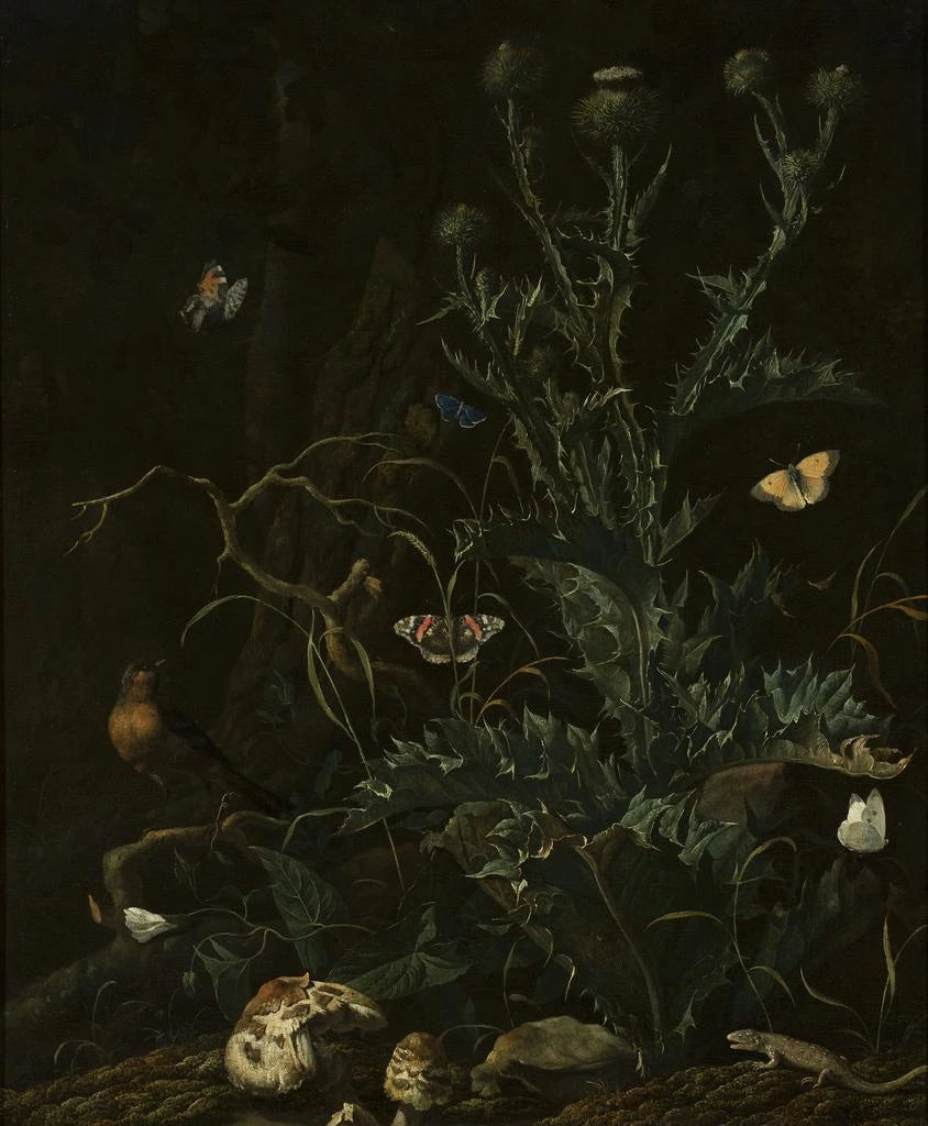 Ten obraz wyróżnia się mistrzowskim użyciem światła i cieni, charakterystycznym dla stylu barokowego. Begeyn umie grać kontrastami, ożywiając swoje motywy, sprawiając, że każdy chardon jest niemal namacalny, każdy motyl delikatny, a każda jaszczurka tętniąca życiem. Kolory, zarówno żywe, jak i subtelnie wyważone, tworzą atmosferę jednocześnie spokojną i dynamiczną. Wybór chardonów, często postrzeganych jako pospolite rośliny, świadczy o uważnym oku artysty na piękno w codzienności. Włączając te elementy do swojej kompozycji, Begeyn podnosi naturę do poziomu sztuki, który intryguje i fascynuje. Układ motywów, z doskonałą równowagą, świadczy o niezrównanej technicznej biegłości, gdzie każdy szczegół jest starannie przemyślany, by przyczynić się do harmonii całości dzieła.