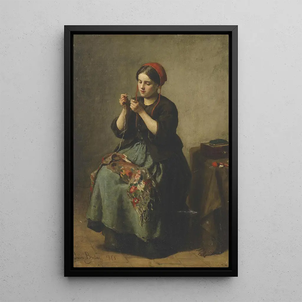 W tym poruszającym dziele Jules Breton ukazuje skupioną na pracy rolniczkę, starannie nawlekającą igłę. Delikatne, miękkie światło oświetlające scenę podkreśla tekstury ubrań i szczegóły twarzy, ukazując autentyczną piękność i spokojną siłę. Pastelowe, subtelne i harmonijne kolory tworzą ciepłą atmosferę, zachęcając widza do docenienia prostoty tego momentu. Kompozycja, skoncentrowana na postaci rolniczki, podkreśla znaczenie pracy ręcznej i godności codziennych obowiązków, czyniąc ten druk artystyczny prawdziwym hołdem dla życia wiejskiego.