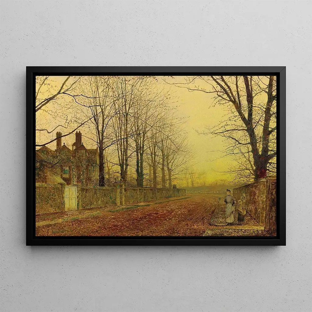 Druk artystyczny Gloire d'automne autorstwa Johna Atkinsona Grimshawa przenosi nas w jesienny pejzaż pełen melancholii i piękna. Złote i pomarańczowe odcienie liści, rozświetlone delikatnym światłem, tworzą niemal magiczną atmosferę. Grimshaw, mistrz światłocienia, używa uderzających kontrastów, aby podkreślić głębię i teksturę natury. Drobne szczegóły drzew i ścieżek wywołują uczucie spokoju i harmonii, podczas gdy niebo, z pastelowymi odcieniami, dodaje scenie poetyckiego wymiaru. To dzieło jest prawdziwym świętem sezonu, uchwycającym efemeryczną urodę jesieni.