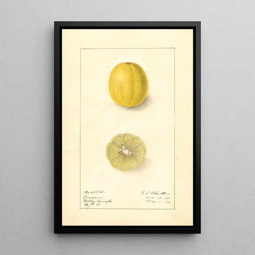 Druk artystyczny Citrus aurantiifolia, podpisany przez Ellen Isham Schutt, jest prawdziwym świętem cytrusów. Żywe odcienie żółci i zieleni przenikają się, tworząc dynamiczną kompozycję, która wywołuje uczucie świeżości i witalności. Artystka używa techniki akwareli, która pozwala oddać światło i teksturę owoców z dużą finezją. To pełne życia dzieło przenosi widza do słonecznego sadza, gdzie aromaty cytryn mieszają się z wizualnym pięknem jaskrawych kolorów.