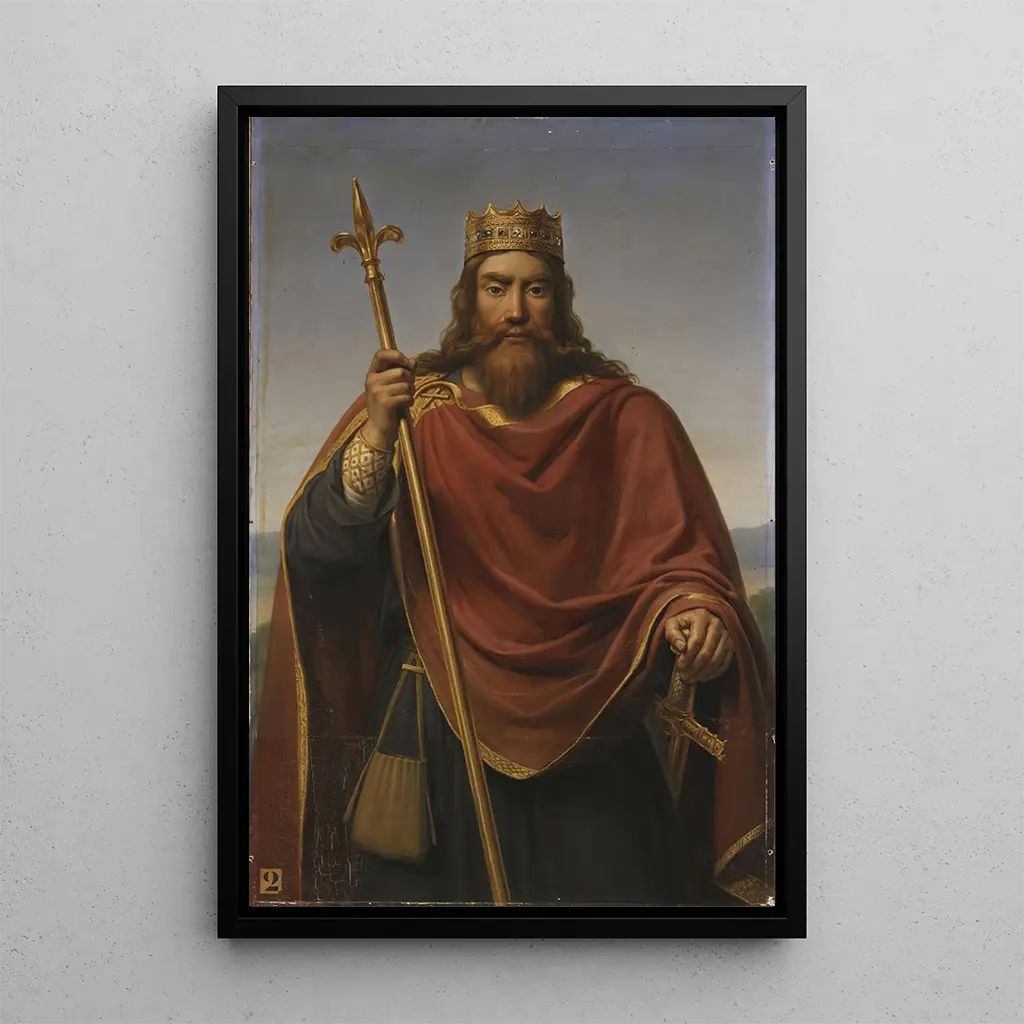 W "Clovis król Franków" François-Louis Dejuinne ukazuje słynnego króla merowińskiego z uderzającą majestatycznością. Obraz, bogaty w szczegóły, podkreśla imponującą postawę Clovisa, otoczonego ikonografią, która odzwierciedla jego władzę i rolę założycielską w historii Francji. Żywe kolory i gry światła i cienia tworzą dramatyczną atmosferę, podkreślając wielkość postaci. Ten druk artystyczny przenosi nas do epoki średniowiecza, gdzie postać Clovisa jest synonimem jedności i siły dla powstającego królestwa.