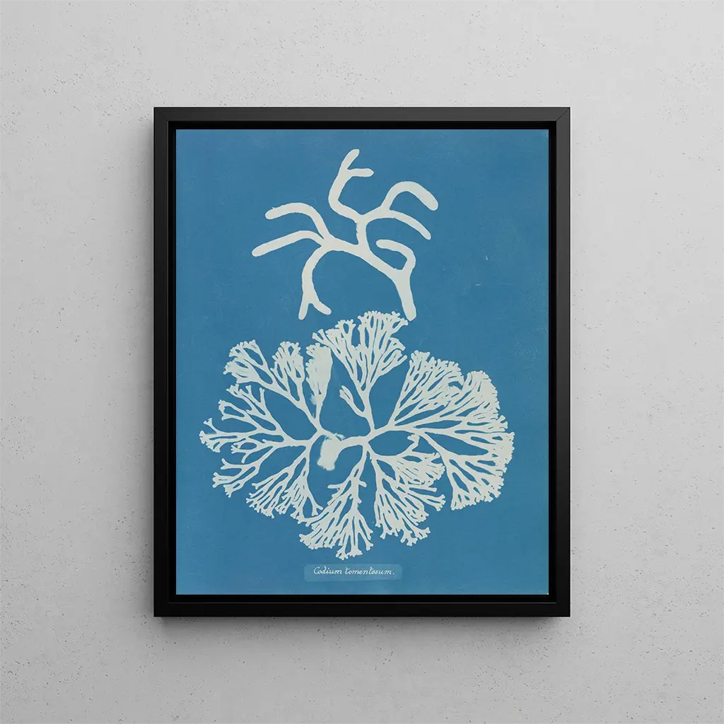Styl Anny Atkins charakteryzuje się dokładnym podejściem i wyczulonym zmysłem obserwacji. "Codium tomentosum" doskonale ilustruje jej zaangażowanie w wierne przedstawianie natury. Za pomocą cyjanotypii, techniki fotograficznej, którą pomogła spopularyzować, Atkins udaje się uwiecznić najdrobniejsze szczegóły alg. Odcienie niebieskiego, typowe dla tej metody, nadają dziełu zarówno eteryczną, jak i namacalną wymowę. Każda odbitka jest unikalna, świadcząc o wyjątkowości każdego okazów. Kompozycja "Codium tomentosum" jest jednocześnie prosta i złożona, grając na organicznych kształtach i negatywnych przestrzeniach, co zachęca widza do głębokiej kontemplacji. To dzieło nie ogranicza się do przedstawienia elementu flory morskiej; wywołuje także refleksję nad kruchością naszego ekosystemu i wewnętrznym pięknem natury.