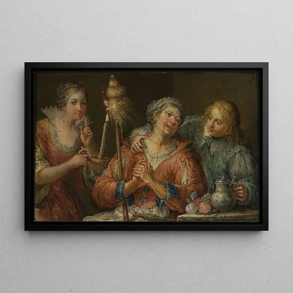 W tej druk artystyczny dzieła "Cour" Johann Georg Platzer przenosi nas w świat ciszy. Kompozycja, delikatnie wyważona, podkreśla postacie w pełnej interakcji, otoczone bujną naturą. Delikatne i ciepłe kolory, od uspokajających zieleni po odcienie ziemiste, tworzą spokojną atmosferę. Technika artysty, zręcznie łącząca światło i cień, ożywia każdy szczegół, zapraszając widza do zanurzenia się w tej idyllicznej scenie. Każdy element, od liści po kostiumy postaci, wydaje się opowiadać historię, będąc zaproszeniem do kontemplacji.