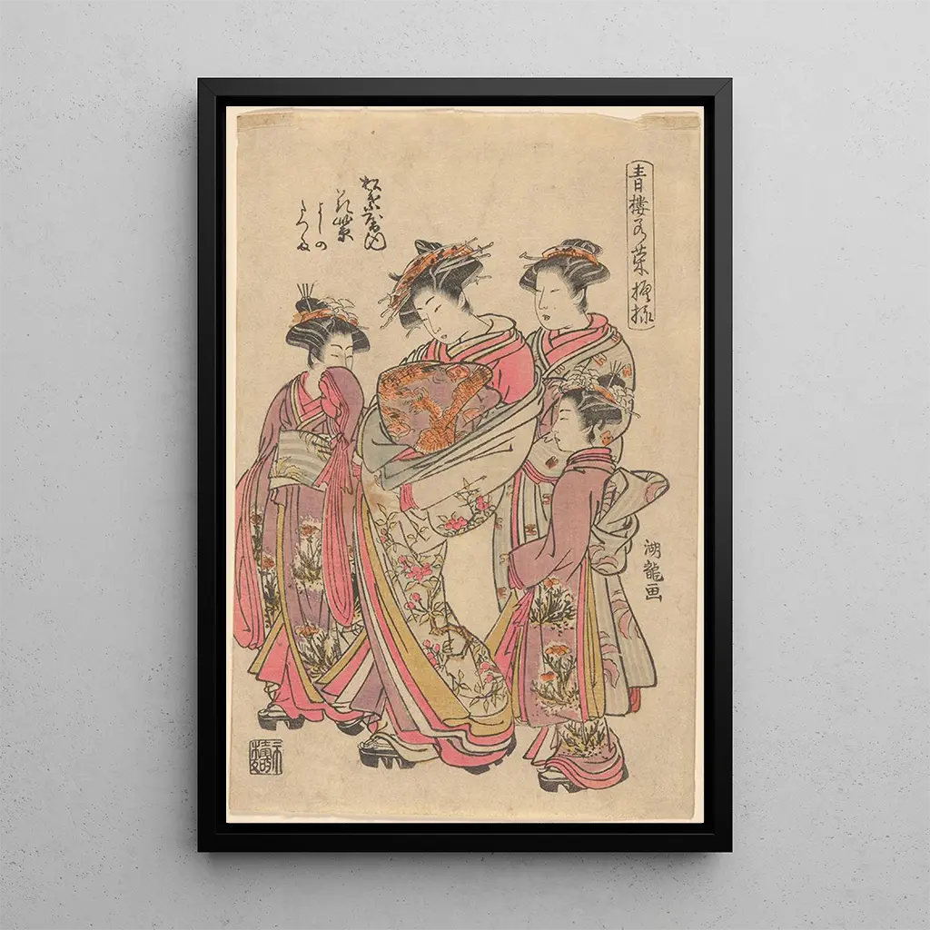Courtisane Hanamusaki i służąca: delikatna i wyrafinowana scena życia Druk artystyczny "Courtisane Hanamusaki i służąca" autorstwa Koryusai Isoda przenosi nas w świat pełen gracji i subtelności. To dzieło, wykonane w delikatnych kolorach i eleganckich liniach, przedstawia kurtyzanę ubraną w bogato zdobiony kimono, w towarzystwie swojej służącej. Drobne szczegóły motywów kwiatowych i tekstur tkanin tworzą intymną, niemal poetycką atmosferę. Kompozycja, zrównoważona i harmonijna, zachęca widza do podziwiania piękna postaci, jednocześnie odczuwając spokój ich otoczenia. Subtelne oświetlenie podkreśla delikatne twarze, ukazując namacalną emocję w tej scenie codziennego japońskiego życia. Koryusai Isoda: mistrz drzeworytu ukiyo-e Koryusai Isoda, aktywny w okresie Edo, jest uznawany za jednego z wielkich mistrzów drzeworytu ukiyo-e. Jego prace wpisują się w artystyczny kontekst, w którym przedstawianie kobiecego piękna i scen z życia miejskiego osiągało szczyt popularności. Pod wpływem tradycji wcześniejszych, jednocześnie innowacyjny w swoich kompozycjach, Koryusai potrafił uchwycić esencję swojej epoki poprzez pełne życia i energii dzieła. Jego styl wyróżnia się użyciem jaskrawych kolorów i wyrafinowanych motywów, które na trwałe zapisały się w historii japońskiego sztuki. Druk artystyczny "Courtisane Hanamusaki i służąca" świadczy o jego umiejętności uwieczniania ulotnych chwil z głębią emocjonalną. Dekoracyjny nabytek o wielu zaletach Wybór druku artystycznego "Courtisane Hanamusaki i służąca" to trafna decyzja, która wzbogaci Twoją dekorację wnętrza. Niezależnie od tego, czy w salonie, biurze czy sypialni, ten obraz wnosi odrobinę elegancji i kultury. Jakość druku gwarantuje wierne oddanie szczegółów, pozwalając cieszyć się wyrafinowaną estetyką dzieła. Dzięki uspokajającym kolorom i delikatnej atmosferze, ta płótno harmonijnie wpisuje się w różne style dekoracji, od tradycyjnych po nowoczesne. Dodając ten druk artystyczny do swojego wnętrza, tworzysz przyjazną i inspirującą atmosferę, jednocześnie celebrując japońskie dziedzictwo artystyczne.