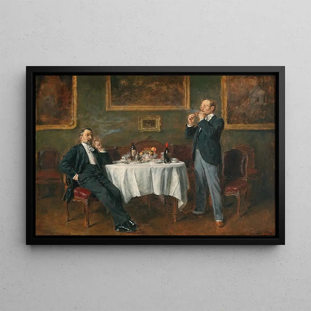 W "Cigares après le dîner" Carl Wilhelm Anton Seiler wprowadza nas w ciepłą i intymną atmosferę. To dzieło, bogate w szczegóły, przedstawia postacie zgromadzone przy stole, delektujące się cygarami i żywymi rozmowami. Ciepłe kolory, od głębokich brązów po błyszczące złocie, tworzą przyjazną atmosferę. Technika Seilera, łącząca realizm z impresjonistycznymi akcentami, ożywia każdą twarz i każdy gest, zapraszając widza do wyobrażenia sobie tego momentu. Delikatne światło, które oświetla scenę, podkreśla towarzyską atmosferę tego wspólnego chwili, czyniąc dzieło szczególnie urokliwym.