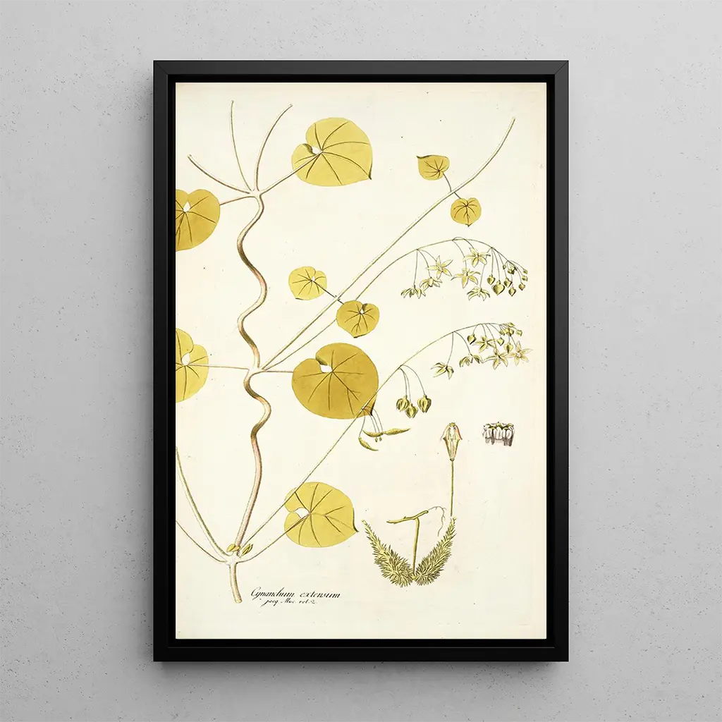 Druk artystyczny Cynanchum extensum przenosi nas w świat, gdzie roślinność rozkwita w niezrównanej obfitości. To dzieło, podpisane przez Nikolausa Josefa Freiherr von Jacquina, prezentuje harmonijną kompozycję, w której formy organiczne łączą się z płynnością. Żywe kolory, od głębokiej zieleni po jaskrawe odcienie żółci, tworzą żywą i dynamiczną atmosferę. Technika akwareli, opanowana przez Jacquina, pozwala uchwycić lekkość i delikatność roślin, oddając hołd pięknu flory.