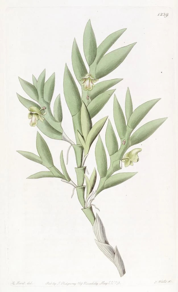 Sydenham Edwards, illustrateur botanique du début du XIXe siècle, a marqué son époque par son approche innovante et son dévouement à l’étude des plantes. Influencé par les découvertes scientifiques de son temps, il a su allier art et science pour créer des illustrations d’une précision remarquable. Le Dendrobium à deux tranchants est un exemple parfait de son talent, illustrant non seulement la beauté de la fleur, mais aussi son importance dans le monde botanique. Edwards a contribué à l’essor de l’illustration botanique, rendant la nature accessible et fascinante pour un large public.