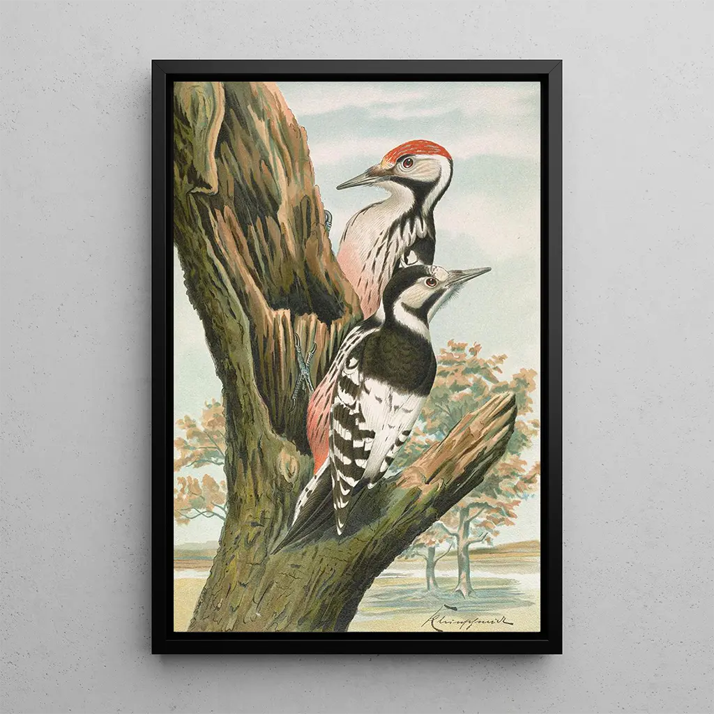 La druk artystyczny de Dendrocopus leuconotus, également connu sous le nom de Pic à dos blanc, évoque une scène paisible de la nature. Ce tableau, riche en détails, présente une palette de couleurs douces, mêlant des nuances de blanc, de noir et de brun. La technique de l'artiste, qui utilise des coups de pinceau minutieux, donne vie à cet oiseau majestueux, perché sur une branche. L'atmosphère qui se dégage de l'œuvre invite à une contemplation silencieuse, où chaque élément semble harmoniser la beauté du monde animal et végétal.