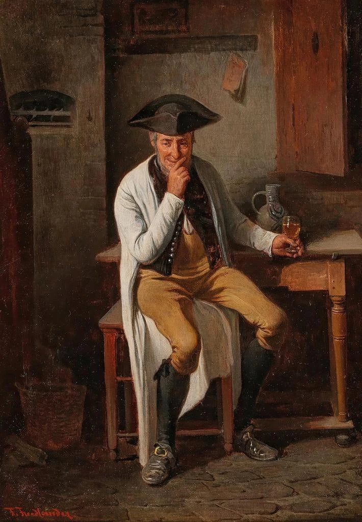 Friedrich Friedländer, aktywny w XIX wieku, często kojarzony jest z przedstawieniami codziennego życia i interakcji międzyludzkich. Jego styl, inspirowany realizmem, koncentruje się na scenach z codzienności, podkreślając emocje i relacje interpersonalne. Chociaż mniej znany niż niektórzy z jego współczesnych, jego dzieło świadczy o głębokim zrozumieniu dynamiki społecznej swojej epoki. "Dobry łyk" doskonale ilustruje to podejście, uchwycając moment wspólnego szczęścia, który wciąż rezonuje dzisiaj.