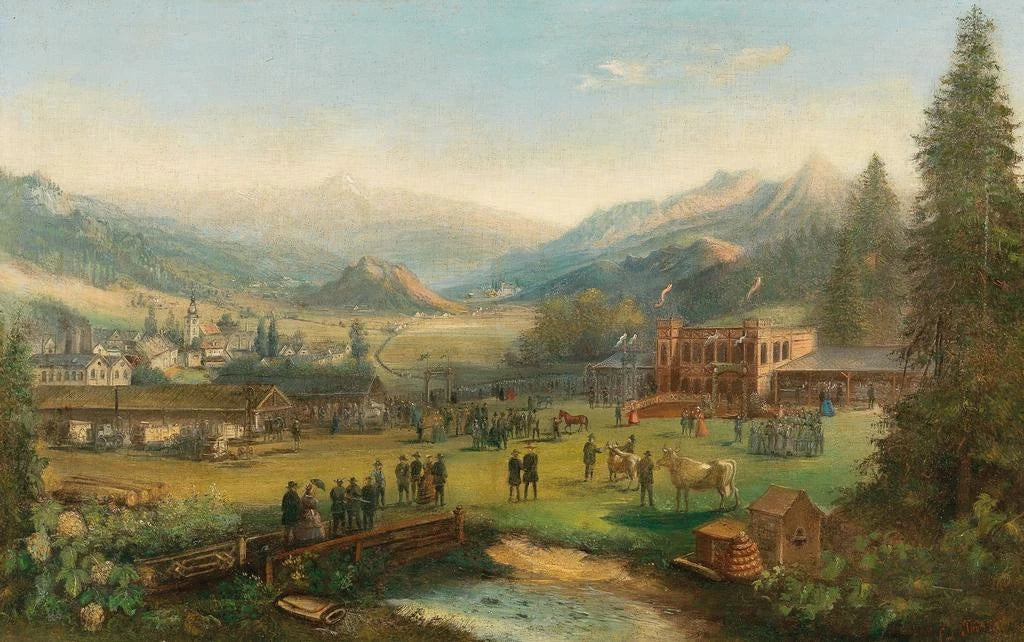La "Vallée avec usine et bâtiment de fête" de Carl Thöndel présente un paysage où la nature et l'architecture humaine coexistent en harmonie. Les teintes verdoyantes de la vallée contrastent avec les structures industrielles, créant un équilibre visuel captivant. La technique de Thöndel, caractérisée par des détails précis et une lumière subtile, donne vie à cette scène, où l'on peut presque entendre le murmure de la nature et le bourdonnement de l'activité humaine. Ce tableau invite à réfléchir sur la relation entre l'homme et son environnement, tout en célébrant la beauté des paysages.