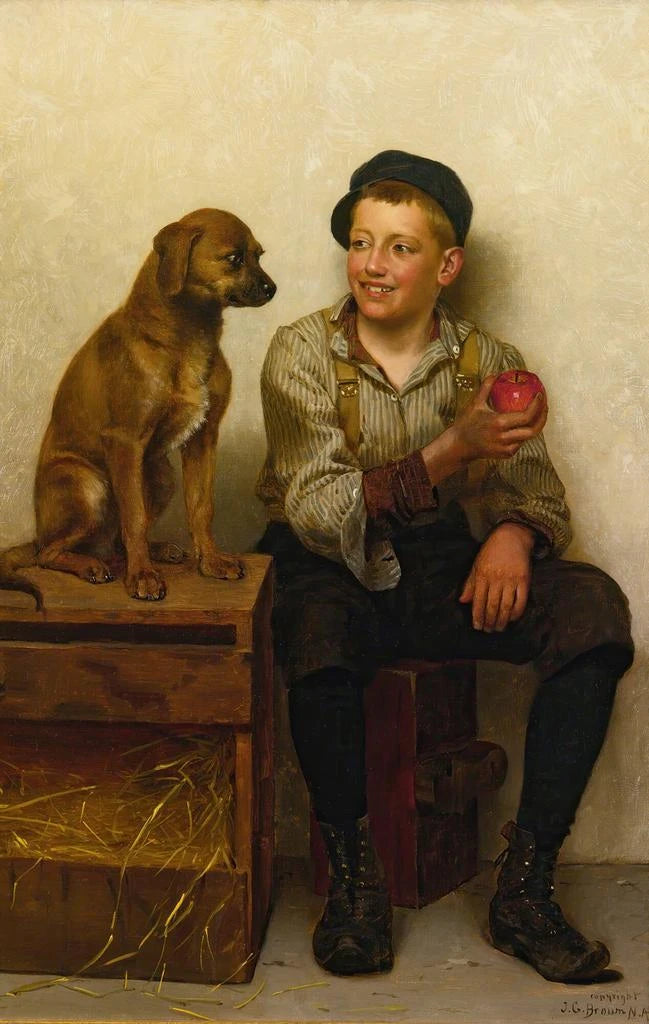 John George Brown, figure emblématique du réalisme américain du XIXe siècle, s'est spécialisé dans la représentation de l'enfance et des scènes de la vie quotidienne. Son style, influencé par les maîtres européens, se caractérise par une attention particulière aux détails et une capacité à transmettre des émotions profondes. À une époque où l'enfance était souvent idéalisée, Brown a su capturer des moments de vérité, comme dans "Taquiner le chiot". Ses œuvres sont un témoignage précieux de la société victorienne, tout en célébrant la beauté des interactions humaines.