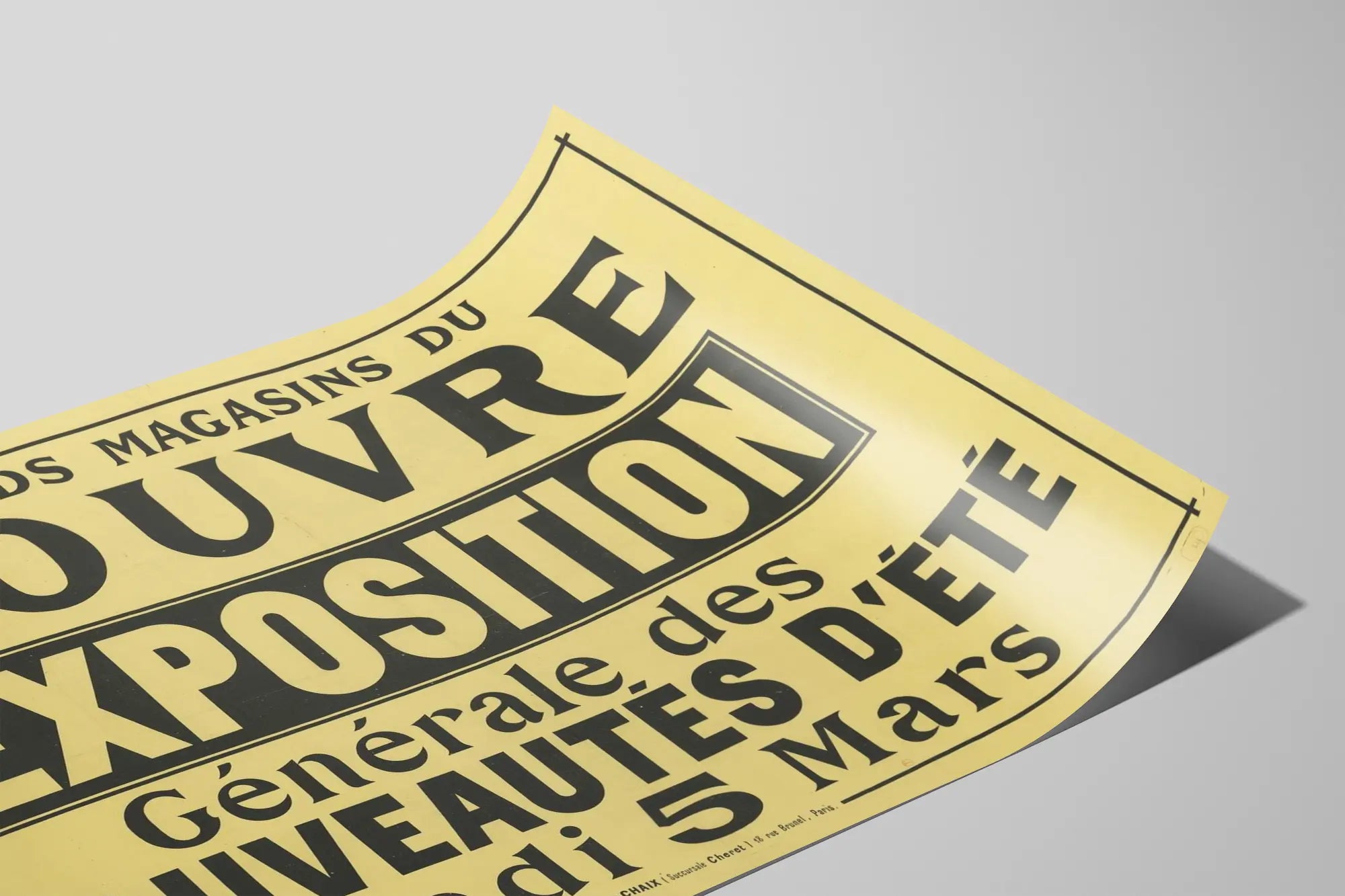 Ta vintage'owa plakat z Wielkich Magazynów Luwru to ikoniczny element dekoracji ściennej. Dzięki graficznemu wzorowi w czerni na żółtym tle, zapowiada ogólną wystawę prezentującą nowości letnie, zaplanowaną na poniedziałek 5 marca. Ten plakat reklamowy, w stylu retro, przypomina elegancję dawnych kampanii komunikacyjnych paryskich domów towarowych. Idealny do ozdobienia ściany z nutą vintage i autentyczności, doskonale wpisuje się w świat dekoracji vintage lub przemysłowej. Jego duży format i typografia w wielkich literach zapewniają silny efekt wizualny, dla tych, którzy pragną oryginalnej dekoracji ściennej z historią. Ten plakat reklamowy zachęca do ponownego odkrycia historycznego aspektu handlowego Paryża, będąc jednocześnie nowoczesnym elementem dekoracyjnym. Niezależnie od tego, czy w salonie, biurze czy sklepie, wyróżnia się prostym, lecz skutecznym stylem typograficznym oraz przejrzystym, zrównoważonym układem. To doskonały wybór dla miłośników grafiki i unikalnej dekoracji ściennej, którzy chcą wprowadzić do wnętrza odrobinę dawnej elegancji.