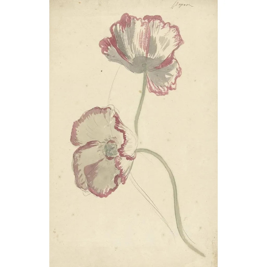 Les "Deux études d'un pavot" d'Elias van Nijmegen révèlent la délicatesse et la richesse des nuances de cette fleur emblématique. Chaque étude présente le pavot sous un angle différent, mettant en avant la texture de ses pétales et la profondeur de ses couleurs. L'artiste utilise une technique d'aquarelle qui confère une légèreté et une transparence à l'œuvre, créant une atmosphère presque éthérée. Cette représentation minutieuse invite le spectateur à apprécier la beauté fugace de la nature, tout en célébrant la virtuosité de l'artiste.