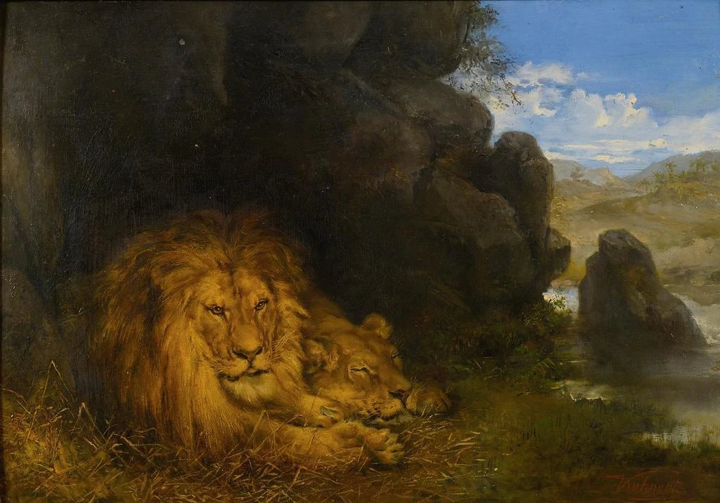 Druk artystyczny | Dwa lwy w jaskini - Wilhelm Kuhnert
