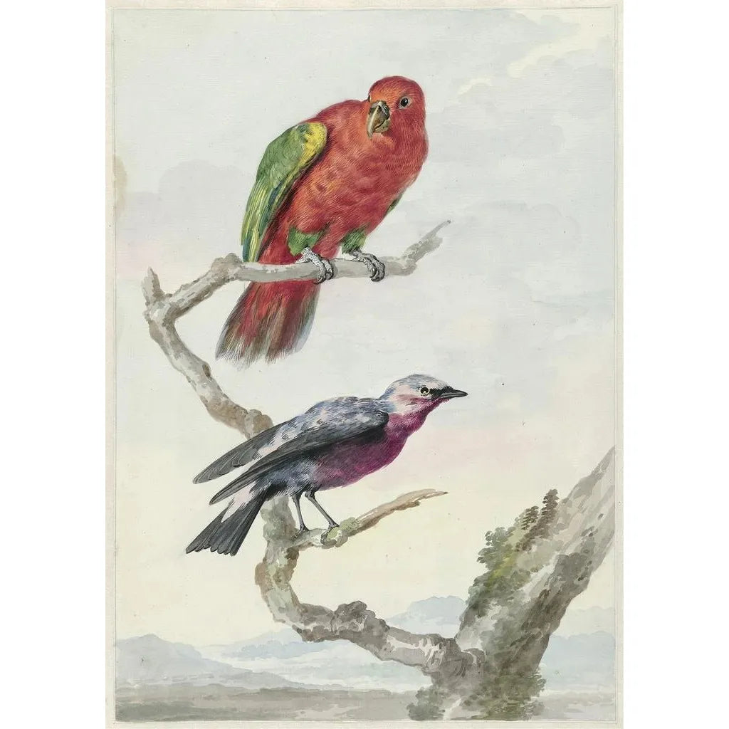 Druk artystyczny | Dwa ptaki, w tym czerwony i zielony papuga - Aert Schouman