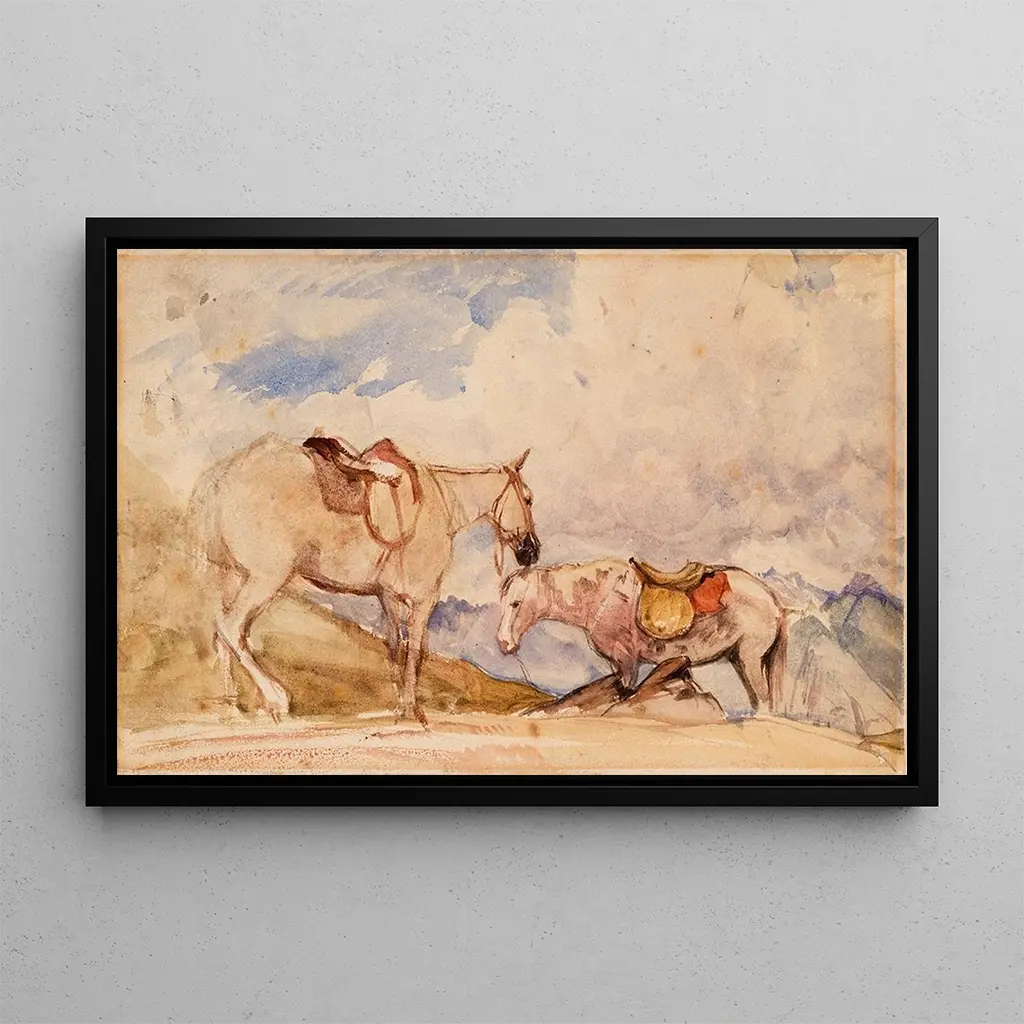 La toile Deux chevaux dépeint une scène majestueuse où deux chevaux se tiennent fièrement, symboles de force et de grâce. Les couleurs vibrantes, allant des bruns chauds aux blancs éclatants, créent un contraste saisissant qui attire immédiatement le regard. La technique de John Frederick Lewis, caractérisée par un souci du détail et une maîtrise des ombres, donne vie à ces animaux, leur conférant une présence presque vivante. L'atmosphère de la peinture évoque une harmonie entre la nature et les créatures qui l'habitent, invitant le spectateur à apprécier la beauté brute de ces animaux.