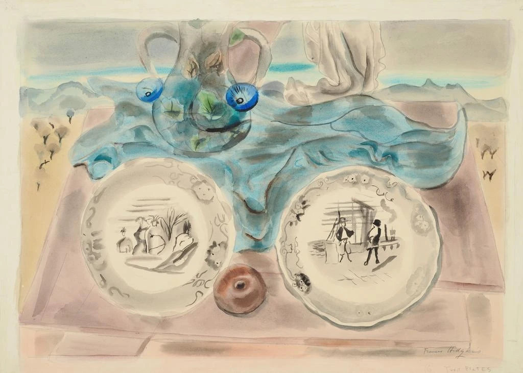Frances Hodgkins nous offre avec Deux Assiettes une œuvre vibrante qui célèbre la beauté des objets du quotidien. La composition, centrée sur les assiettes, est rehaussée par des motifs floraux éclatants qui s’entrelacent avec grâce. Les couleurs, allant des rouges profonds aux verts lumineux, créent une harmonie visuelle captivante. La technique de l’aquarelle, maîtrisée par Hodgkins, permet de jouer avec la transparence et la lumière, donnant vie à chaque détail. Cette toile, à la fois simple et riche, nous invite à apprécier la beauté des choses ordinaires.